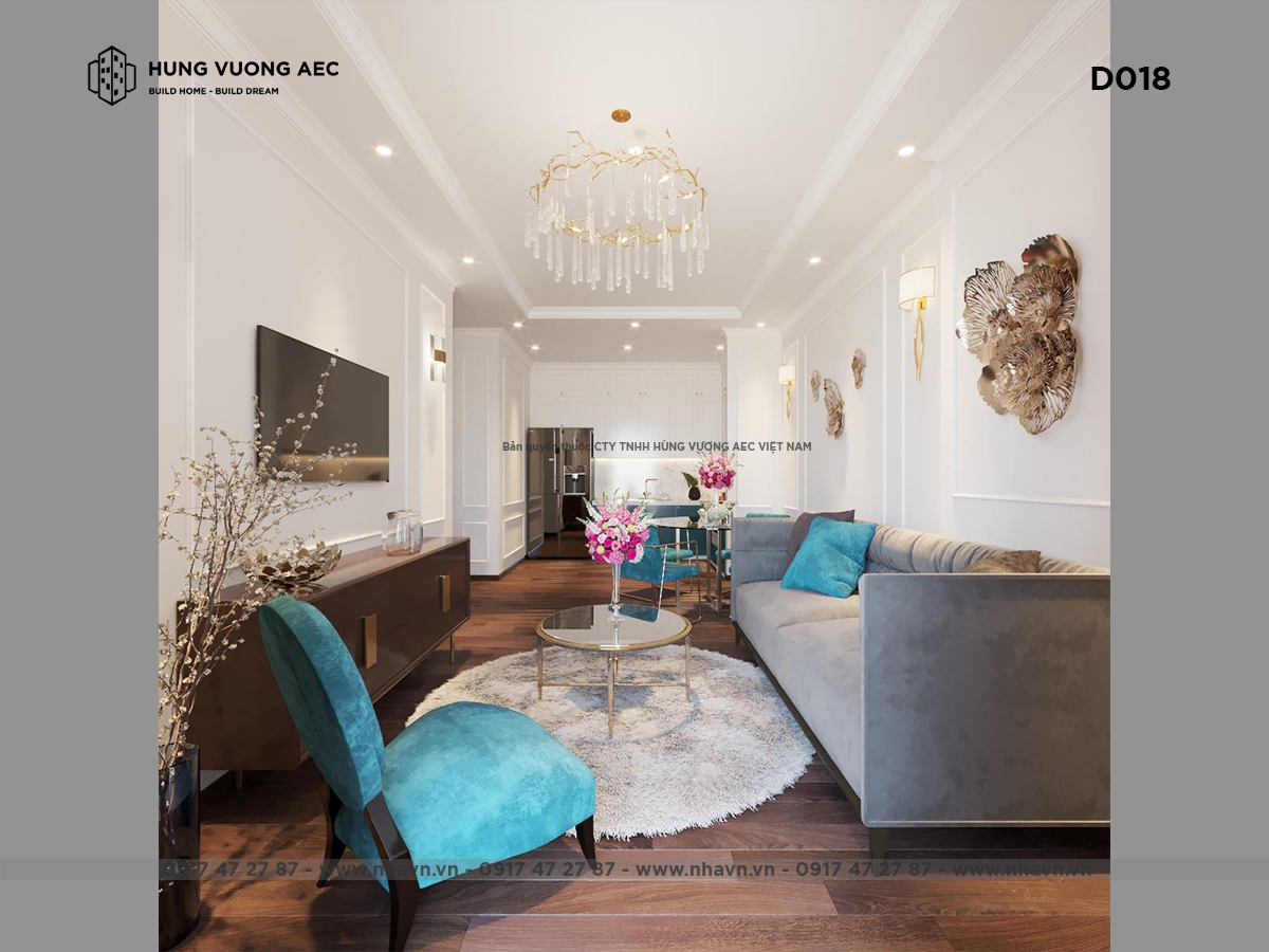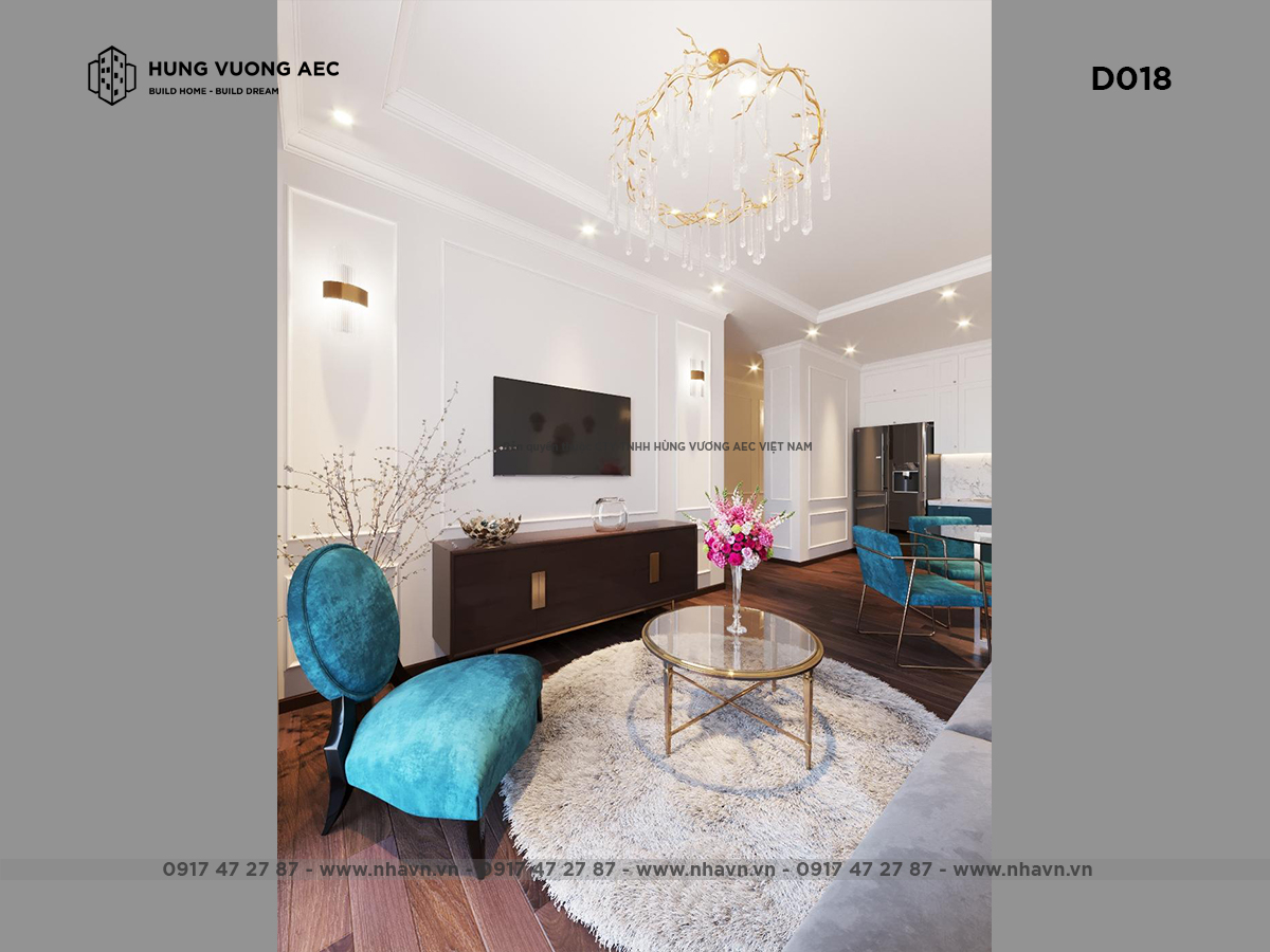 Nội thất chung cư mang phong cách hiện đại, không quá cầu kỳ, nhưng vẫn toát lên nét đẹp riêng biệt cho riêng mình. Đặc biệt kiến trúc sư đã điểm vào không gian bảng màu tươi tắn, độc đáo với tông màu xanh của ghế tạo điểm nhấn riêng cho phòng khách, và màu nâu của nền nhà tạo cảm giác hài hòa, tinh tế cho căn hộ. Thiết kế của những vật dụng trong nhà đều được tính toán, lựa chọn cẩn thận giúp đem lại một không gian ấm cúng, an toàn cho gia chủ.