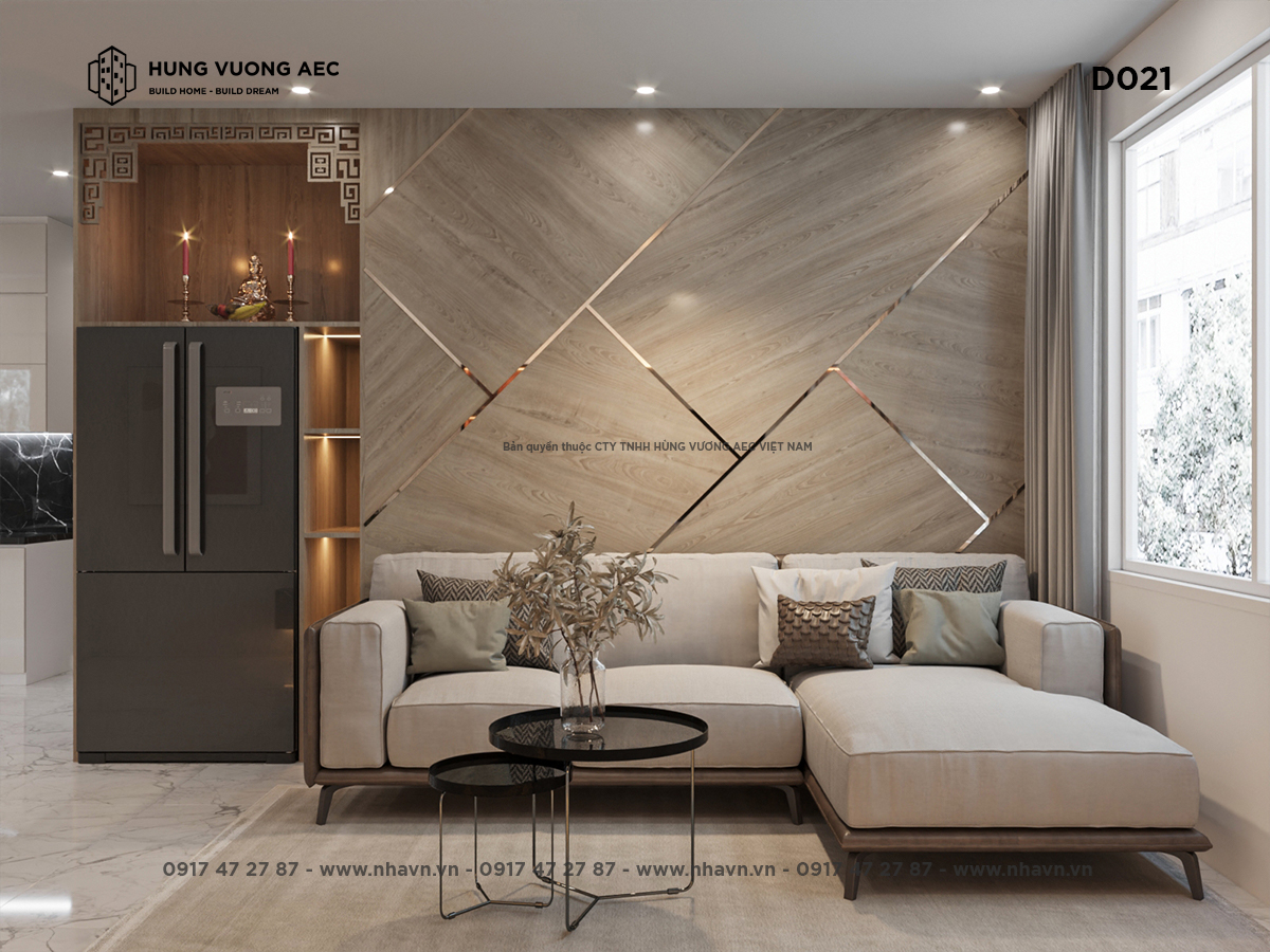 Khác với căn hộ theo phong cách cổ điển mang trong mình dáng vẻ quý tộc sang trọng, căn hộ chung cư hiện đại hiện lên với sự đơn giản, tinh tế qua từng chi tiết dù là nhỏ nhất. Ngay khi bước vào phòng khách, điểm nhấn thu hút mọi ánh nhìn đến từ bộ sofa cỡ lớn với phối màu vải kem. Dù có kích thước lớn nhưng với sự sắp xếp tài tình, bộ sofa trông hài hòa với tổng thể căn phòng, là nơi để các thành viên trong gia đình sum họp, quây quần bên nhau. Những khu vực bếp và phòng ngủ cũng được thiết kế theo nguyên tắc 3 không, không cầu kỳ – không dư thừa – không nhàm chán. Nguyên tắc này đem lại một sự tinh tế tối giản cho tổng thể căn hộ nhưng vẫn giữ được sự mềm mại nhất định, nhưng cũng không đem lại sự đơn điệu, nhạt nhòa cho căn hộ chung cư.