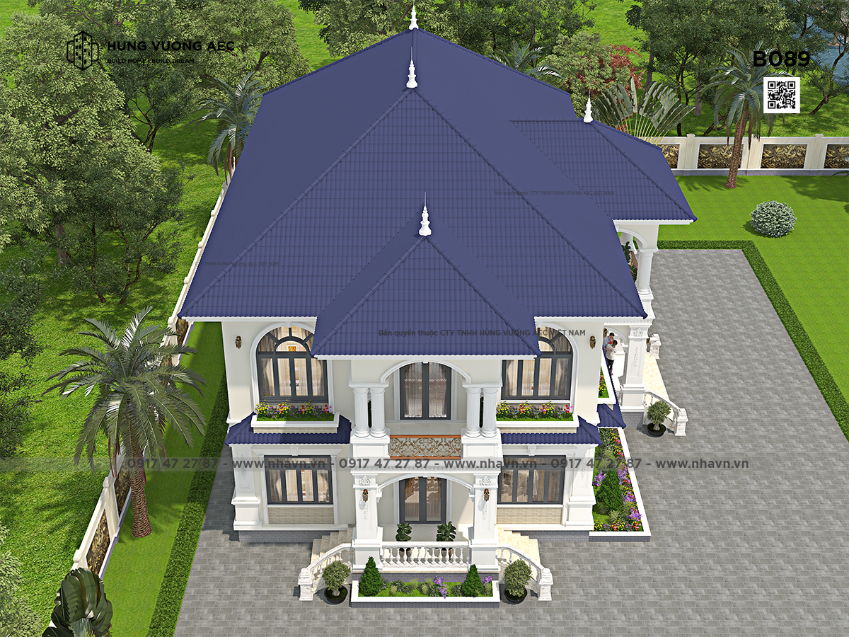 Với mẫu biệt thự tân cổ điển 2 tầng này, các kiến trúc sư từ Hung Vuong AEC đã khéo léo lựa chọn thiết kế mái Nhật cho công trình của gia đình, bời hệ mái Nhật có những ưu điểm vượt trội cả về công năng lẫn tính thẩm mỹ so với các hệ mái khác. Mái Nhật có cho mình một khuôn mái dễ chịu, đồng đề và cân bằng, là sự kết hợp hài hòa giữa mái Thái và phong cách mái mang âm hưởng châu Âu cổ điển. Chính sự khéo léo trong việc dung hòa các yếu tố tưởng chừng đối lập nhau của phương Đông và phương Tây đã tạo nên một điểm nhấn độc đáo, khác lạ nhưng không kém phần tinh tế cho căn nhà.