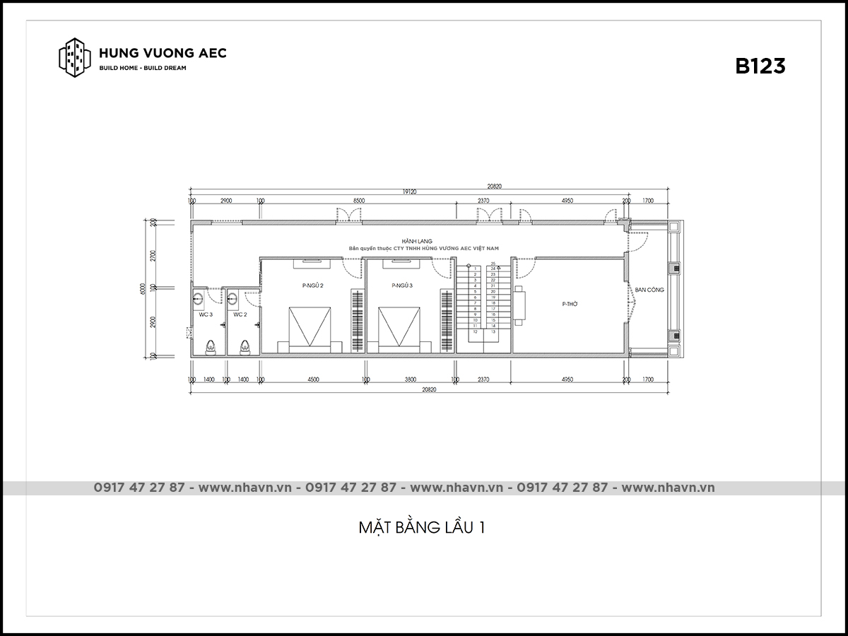 Lầu 1 được thiết kế với 2 phòng ngủ, phòng thờ, và khu vực ban công.
