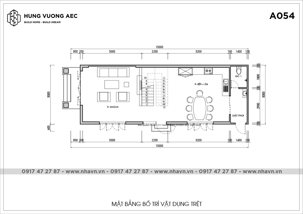Tầng trệt gồm phòng khách, phòng bếp kết hợp với phòng ăn, khu vệ sinh và giặt phơi.