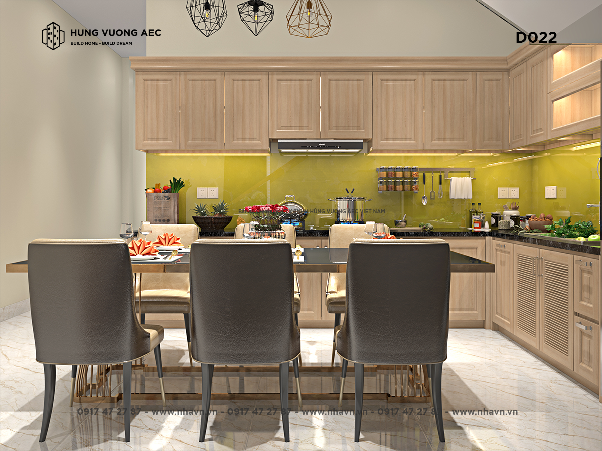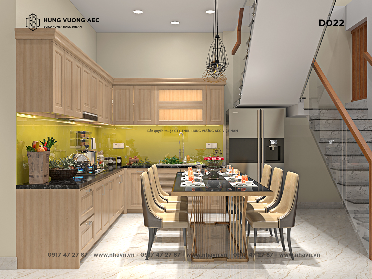 Từ xưa ông cha ta đã quan niệm rằng căn bếp chính là nguồn sinh lực của căn nhà, là nơi giữa lửa, giữ một phần viên mãn của gia đinh. Chính vì thấu hiểu quan niệm cổ xưa đó, Hung Vuong AEC đã tạo nên một căn bếp với đầy đủ tiện nghi cùng một thiết kế thuận tiện trong việc bếp núc của gia đình. Bằng hệ tủ bếp treo và tủ gầm độc đáo với những đường nét tối giản nhưng không kém phần hấp dẫn. Ngoài ra, với phong cách thiết kế nội thất hiện đại nhằm tiết kiệm không gian cho nhà phố, bếp được nối liền với phòng khách vừa tạo cảm giác liền mạch, vừa giúp căn nhà trở nên thoáng hơn và không đem lại cảm giác tù túng.
