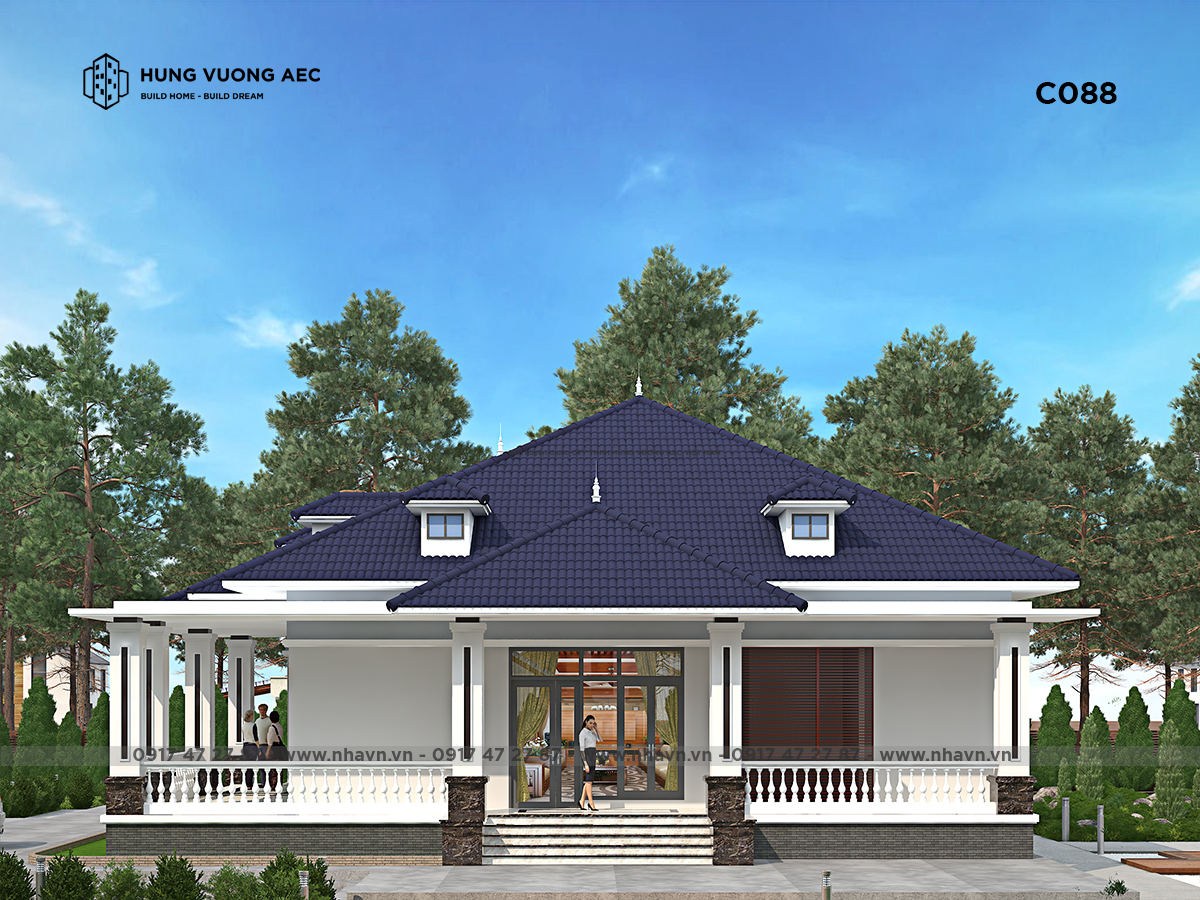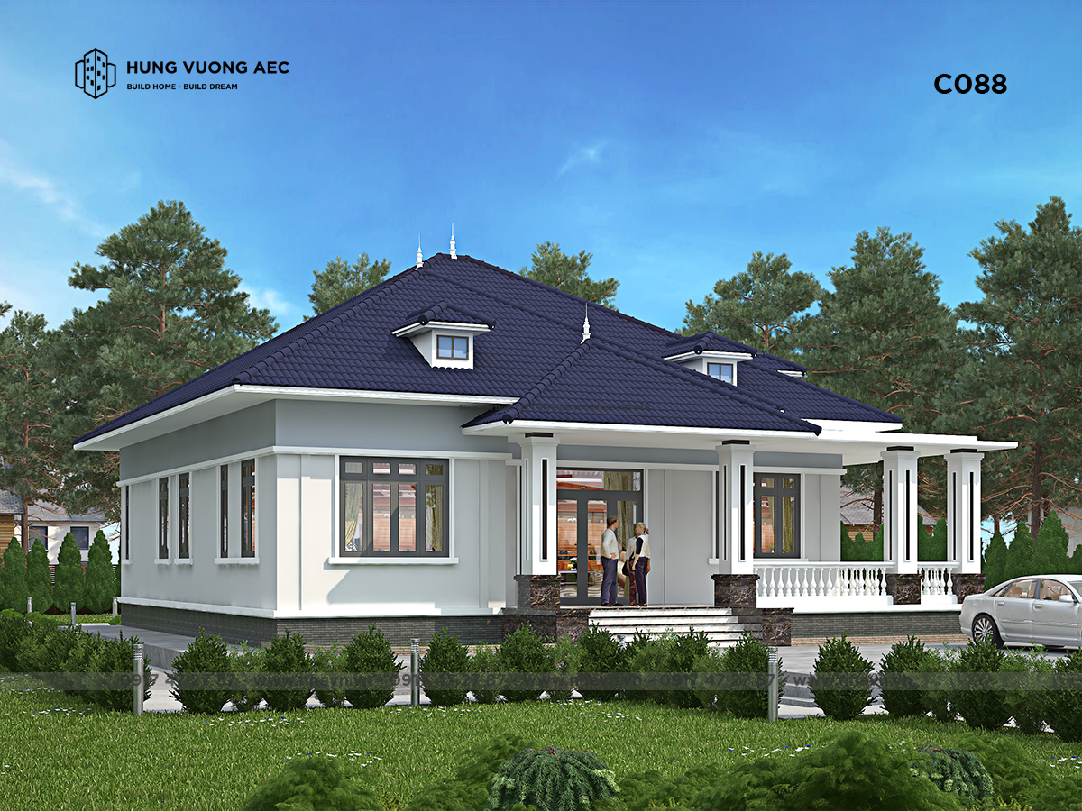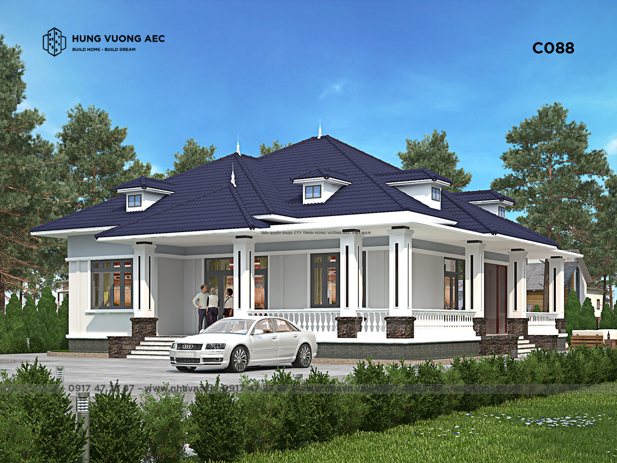 Biệt thự nhà vườn 1 tầng 3 phòng ngủ không chỉ ấn tượng về kiến trúc mà còn kết hợp khéo léo với khoảng sân vườn rộng rãi bên ngoài, mang đến một không gian sống, nghỉ dưỡng tuyệt vời. Biệt thự nhà vườn 1 tầng với thiết kế phong cách tân cổ kết hợp với hệ mái Thái ấn tượng. Kiến trúc sư đã tối giản những họa tiết, chỉ giữ lại tinh hoa của kiến trúc này. Bởi lẽ với quy mô 1 tầng, việc tối giản sẽ làm biệt thự trở nên thanh thoát hơn. hạn chế được sự nặng nề, rối rắm.Điểm nhấn đắt giá của thiết kế biệt thự nhà vườn 1 tầng đẹp này chính là khu vực sảnh chính. Nơi đây được thiết kế bằng hệ cửa nhôm kết hợp với kính. Hệ trụ cột vuông phía trước nâng đỡ “vương miện” được chạm khắc phù điêu hoa văn tỉ mỉ rất sang trọng và đẳng cấp.