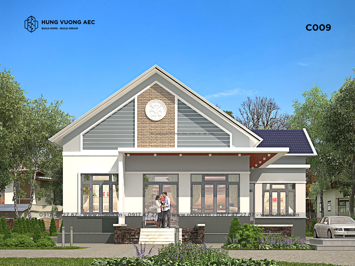 Phần hồi trước được trang trí chi tiết, phần thân mái được ốp gạch nghệ thuật và cách xử lý khối đua phần hiên gắn với trụ cột mặt tiền ở hai bên, tôn lên sự thanh thoát của mẫu nhà cao ráo. Kiến trúc mái giật cấp nhẹ, khoảng tường phần hiên được trang trí phá cách, sân trước thoáng và rộng tạo nên điểm nhấn khá mạnh mẽ cho mẫu nhà cấp 4 mái thái hiện đại.