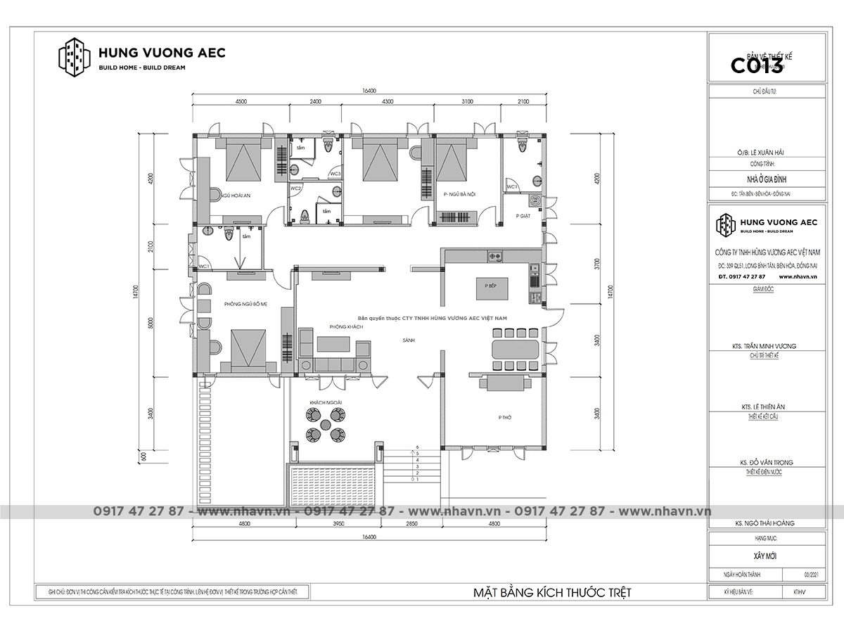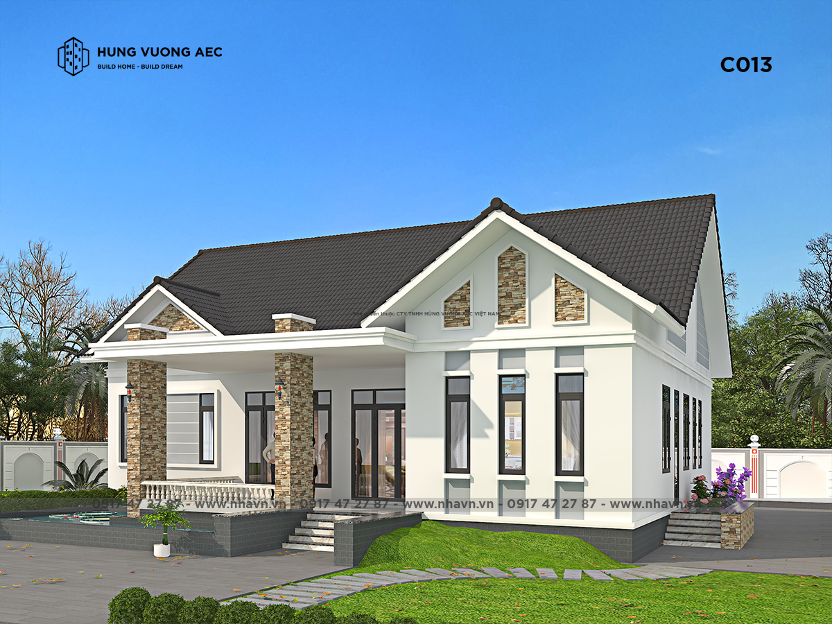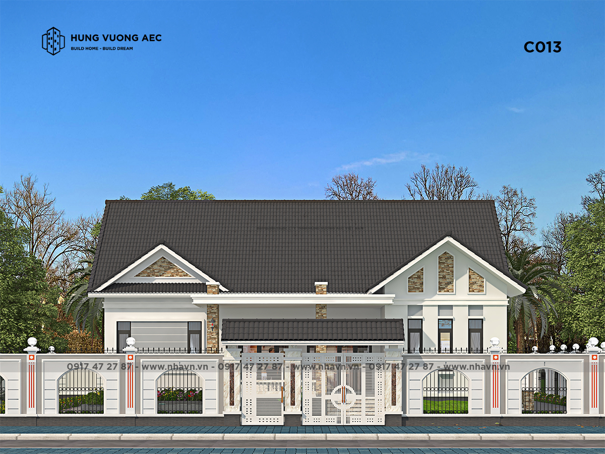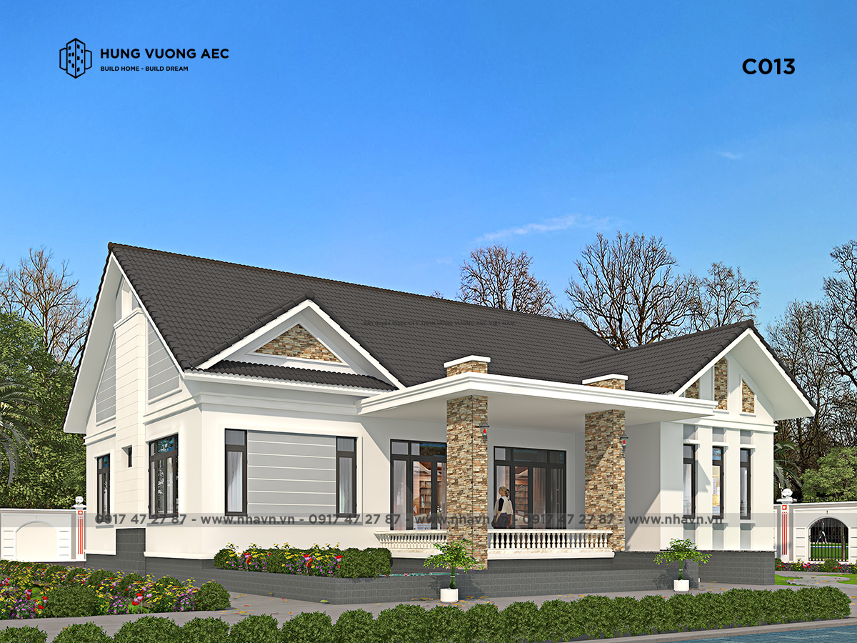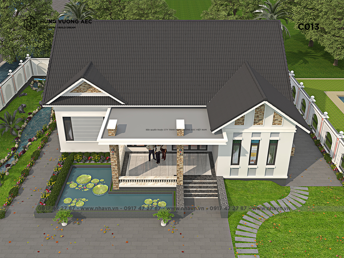Chủ đầu tư yêu cầu thiết kế khoảng hiên chính và phụ để không gian trước thêm thoáng và hiện đại hơn. Sân trước thiết kế rộng cùng với cảnh quan thiên nhiên để đảm bảo không gian sống khoa học và có tính thẩm mĩ cao nhất cho ngôi nhà.