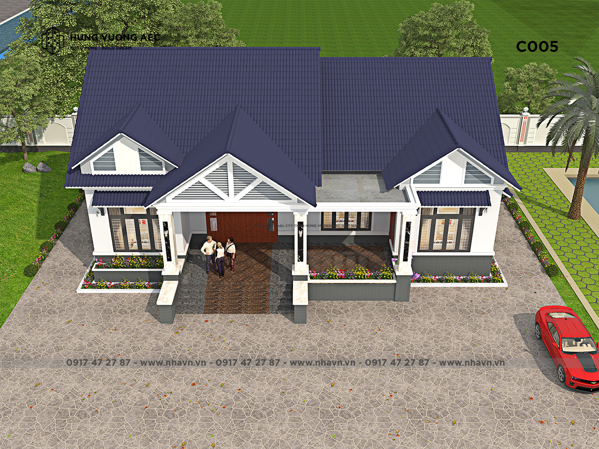 Mặt tiền phải thoáng đãng, bậc tam cấp thiết kế chiều rộng bằng chiều rộng của cửa chính để đảm bảo tính phong thủy cao nhất. Mãi ngói thái sử dụng ngói màu xám hiện đại, màu hợp mệnh và là màu ngói gia chủ thích nhất. Hệ thống cửa sổ thiết kế rộng thoáng với cửa 4 cánh để đảm bảo việc đón nhận ánh sáng và lưu thông gió vào bên trong.