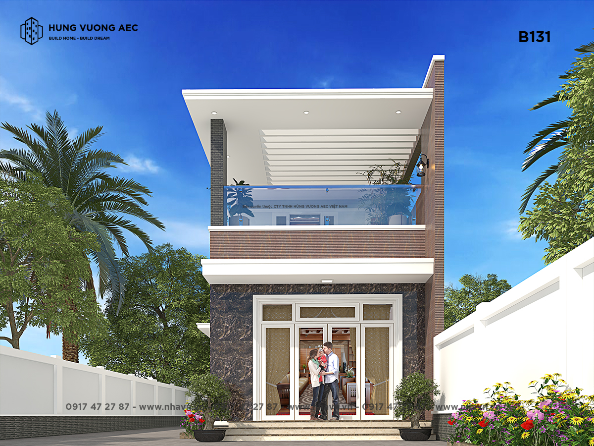 Kiến trúc mặt tiền ngôi nhà này được thiết kế với tông màu trắng xám sang trọng trẻ trung. Nhấn nhá vài mảng tường màu nâu của gạch vân gỗ 150×800 ốp tường. Hàng lan can ban công kính 12 ly cường lực âm sàn chạy suốt chiều dài hai ban công trước và sau gần 20m tôn thêm nét đẳng cấp và sang trọng cho mẫu nhà này.