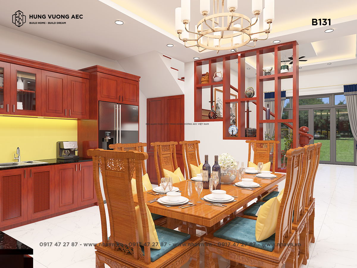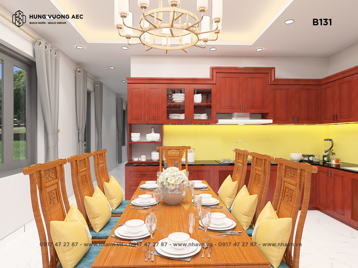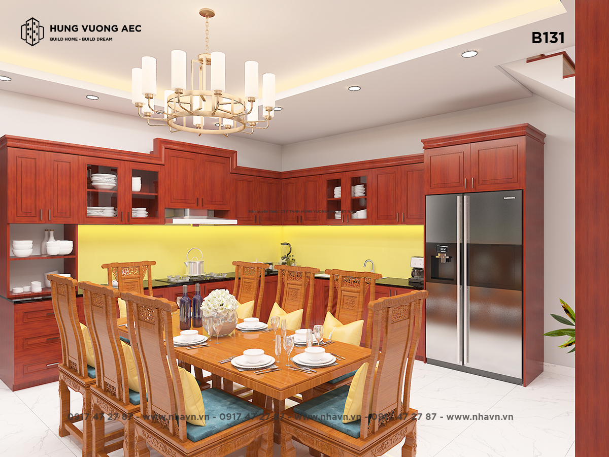 Thiết kế nội thất phòng bếp với thiết kế bàn ăn gỗ sọc
