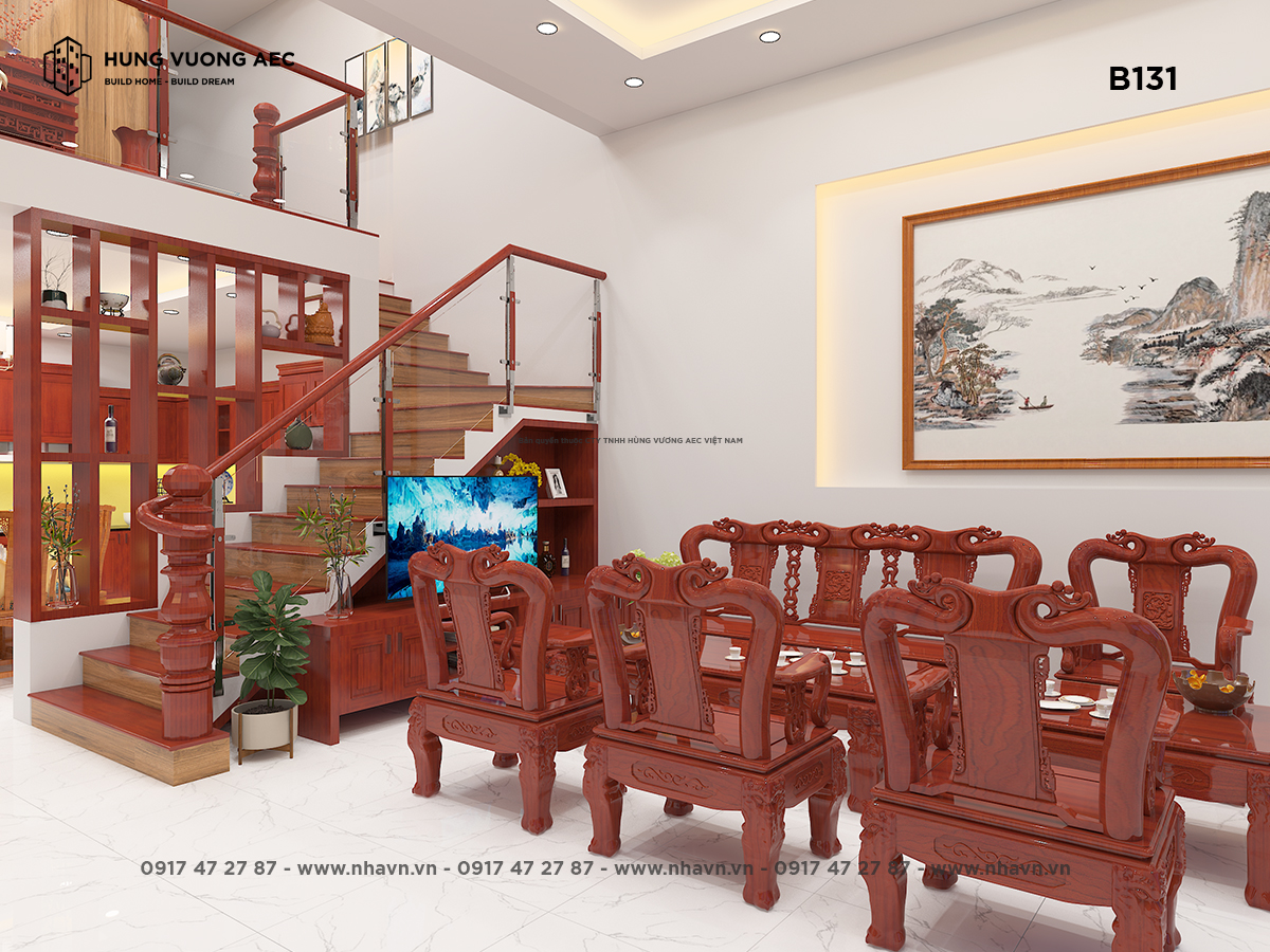Không gian phòng khách bao gồm cầu thang khoảng 45m2 đủ để bố trí bộ salon cỡ đại. Diện tích 55m2 còn lại chia cho phòng bếp, phòng ngủ khách và 1 nhà vệ sinh chung.