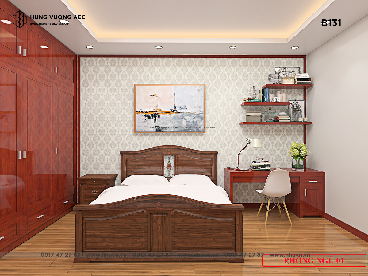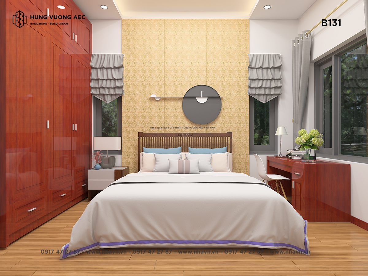 Nội thất phòng ngủ với vách đầu giường ốp giấy dán tường.
