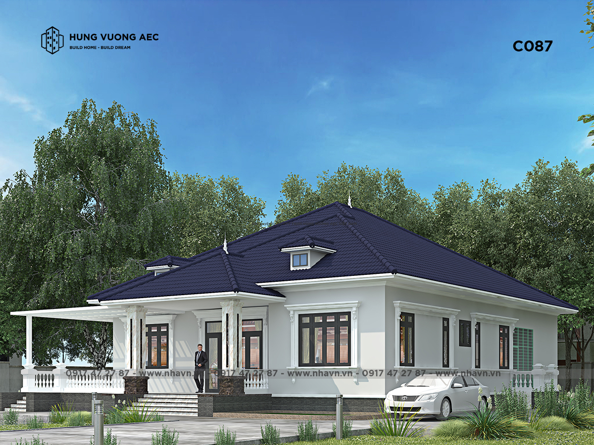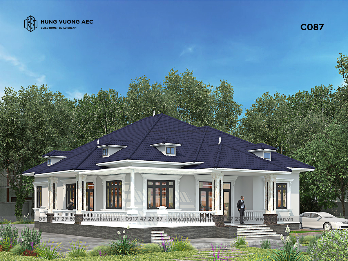 Thiết kế mái ngói xám nổi bật tạo nên điểm nhấn thú vị mang lại cho không gian kiến trúc ngoại thất của công trình vẻ đẹp kiến trúc hiện đại mang nét đẹp truyền thống ngàn đời của cha ông với nếp nhà 3 gian mái ngói. Mái ngói theo phong thủy trong nhiều công trình kiến trúc đều thể hiện được vẻ đẹp trọn vẹn, năng động tươi mới, thịnh vượng và mang lại nhiều may mắn cho gia chủ. Hệ thống mái của mẫu thiết kế biệt thự đẹp sử dụng kết cấu đổ bê tông mái bằng, sau đó xây tường thu hồi và lợp vì kèo sắt hộp lên trên. Thiết kế mái cũng được sử dụng theo kiểu mái chữ A truyền thống. Hình dạng và kết cấu mái này mang đến cho công trình sự chắc chắn, kiên cố. Phần mái chữ A được giật cấp, tạo nên sự mới mẻ và hấp dẫn cho mắt nhìn. Kết cấu mái ngói là một trong những loại mái được sử dụng khá phổ biến hiện nay, nó thể hiện được sự chắc chắn, cũng như bề thế cho tổng thể không gian kiến trúc của công trình đó. Mặt bằng công năng của mẫu biệt thự 1 tầng 320m2 được sử dụng hết sức khoa học, tiện nghỉ và chắc chắn trong bố cục các phòng chức năng, cũng như đảm bảo được nhu cầu sử dụng của ngôi nhà. Sở dĩ diện tích sàn tương đối lớn, gia đình muốn đặt gara bên ngoài mặt bằng công năng sử dụng phía đối diện cổng chính của mặt tiền ngôi nhà. Điều này càng khiến cho diện tích sàn tầng 1 trở nên rộng rãi và thoáng mát hơn. Đặc biệt, với những không gian mang đậm tính kết nối, mới mẻ và rộng rãi thì ngôi nhà cũng được đánh giá cao với giá trị thẩm mỹ, cũng như sự trọn vẹn trong bố cục kiến trúc của công trình. Ngôi nhà với 4 phòng ngủ được chủ nhà đánh giá cao bởi cách sắp xếp và bố trí mặt bằng công năng sử dụng.