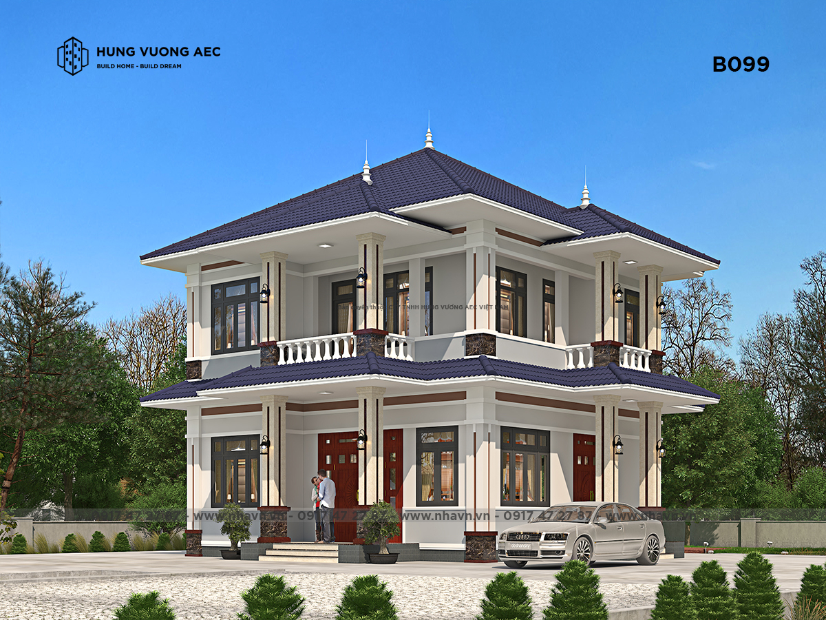 Mặt tiền ngôi nhà chính là hạng mục quan trọng nhất bởi đây chính là chìa khóa giúp căn Biệt thự trở nên khác biệt hơn. Màu trắng chủ đạo được sử dụng trong thiết kế ngoại thất của ngôi nhà, thể hiện sự tinh khiết, sang trọng, làm nổi bật những đường phào chỉ, phào phân tầng, làm cho ngôi nhà tỏa sáng dưới ánh nắng mặt trời. Để tạo điểm nhấn cho ngoại thất ngôi nhà, dải tường áp mái được lát gạch thẻ màu nâu, kết hợp với màu xanh than của hệ mái Nhật, tất cả đã tạo nên sự đồng điệu trong hình khối kiến trúc của ngôi nhà.
