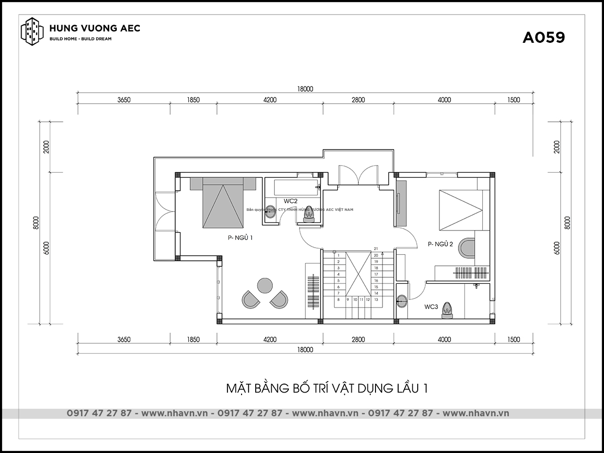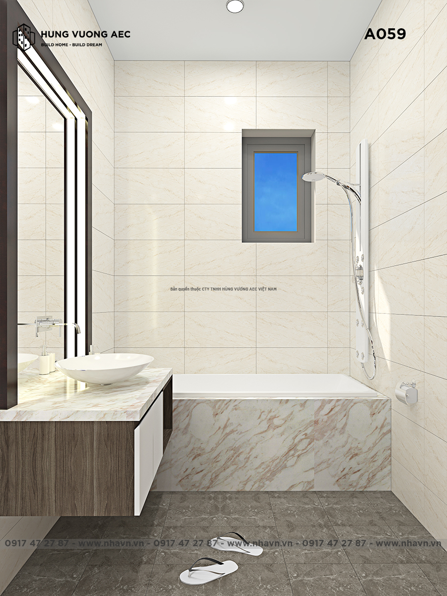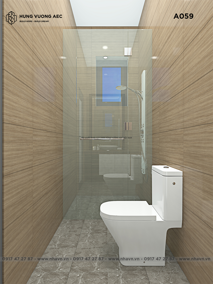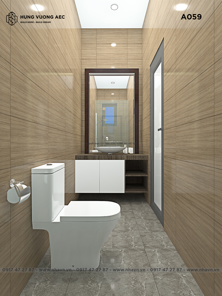 Từ cầu thang thông tầng tiến lên lầu 1 bên tay phải là khu vực phòng ngủ vợ chồng, bố trí hướng ra ban công mặt tiền, có nhà vệ sinh riêng và khu vực trang điểm, tủ kệ treo đồ. Bên tay trái cầu thang là không gian sinh hoạt của con trai, thiết kế mở, có lối ban công sau nhà, có nhà vệ sinh khép kín, tủ kệ đồ.