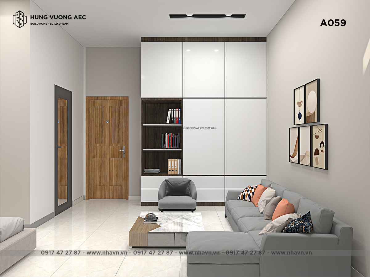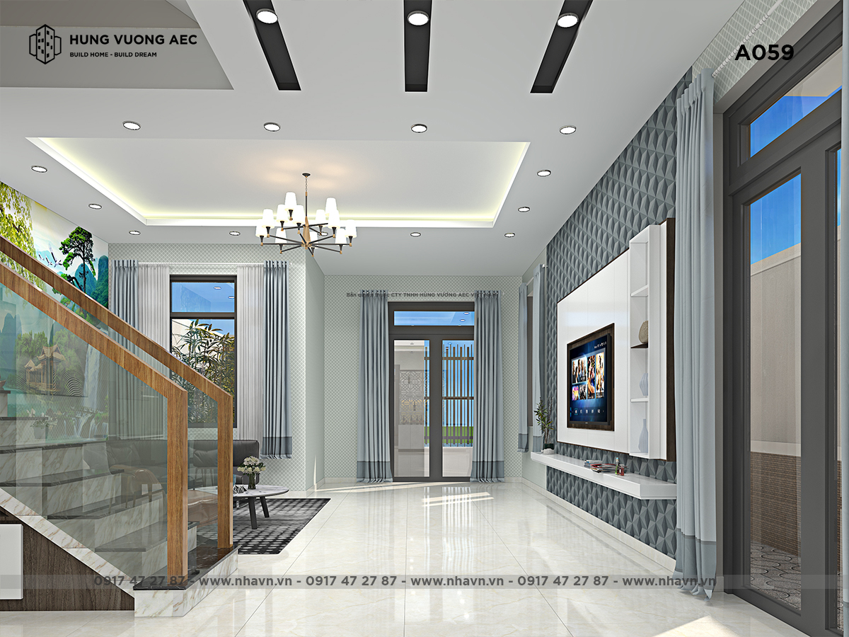 Thiết kế phòng khách khá rộng và thoáng mát khi đặt sát cửa cổng chính, cùng với tiểu cảnh sân vườn sát bên, giúp điều hòa và cân bằng không khí trở nên mát mẻ và trong lành. Đối diện tiểu cảnh là cầu thang thông tầng, tiếp sâu bên trong là khu vực chức năng phòng bếp và ăn, thiết kế đảm bảo sự thoáng khí, tránh mùi thức ăn đọng lại, cuối cùng là nhà vệ sinh chung.