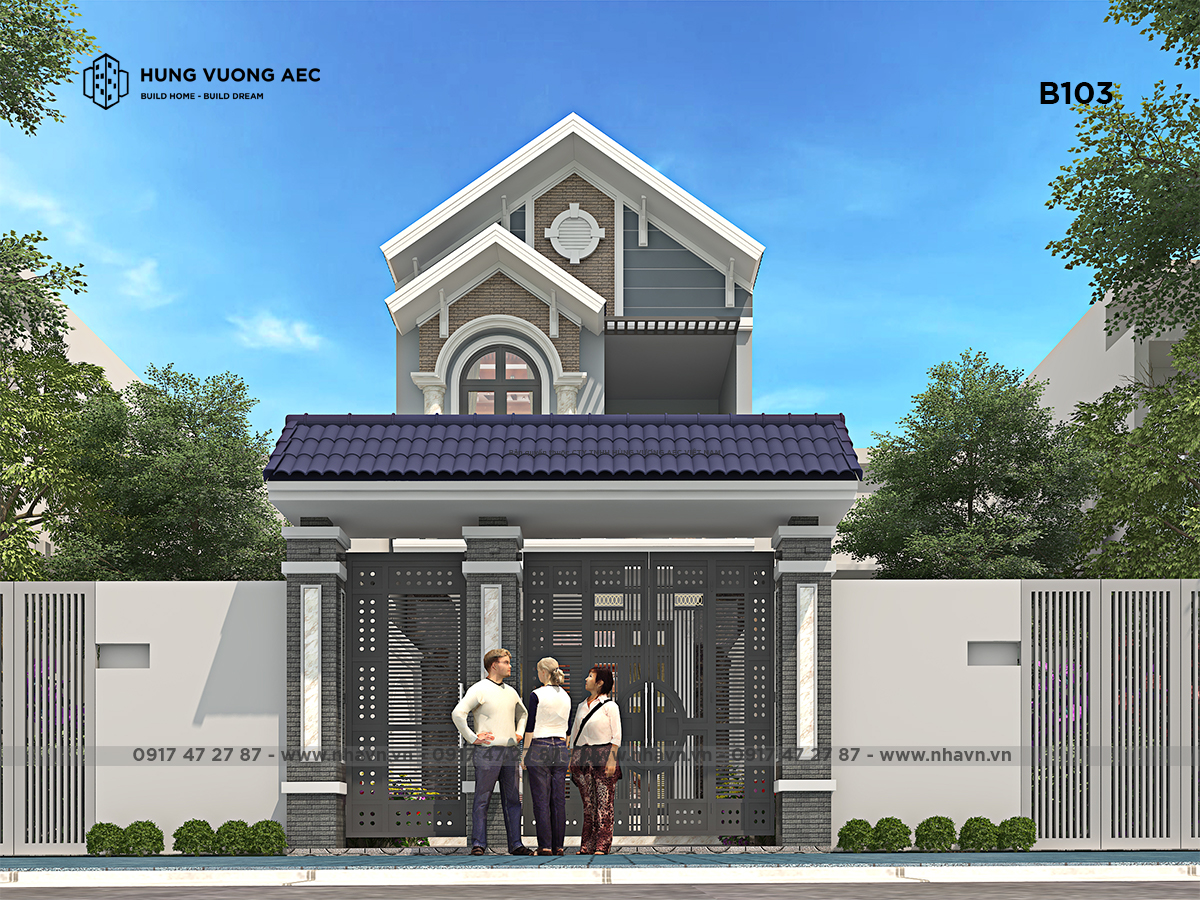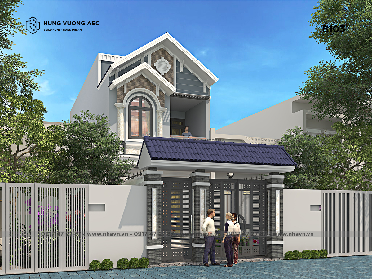 Thiết kế nhà ống 2 tầng mái thái hiện đại được kiến trúc sư triển khai theo phong cách có sự pha trộn giữa hiện đại và có chút yếu tố nhẹ nhàng của phong cách tân cổ điển. Kiến trúc mái thái luôn đi cùng với thiết kế kiến trúc trụ cột, tuy nhiên kết cấu và trang trí bên ngoài của công trình đã được thiết kế giản lược.