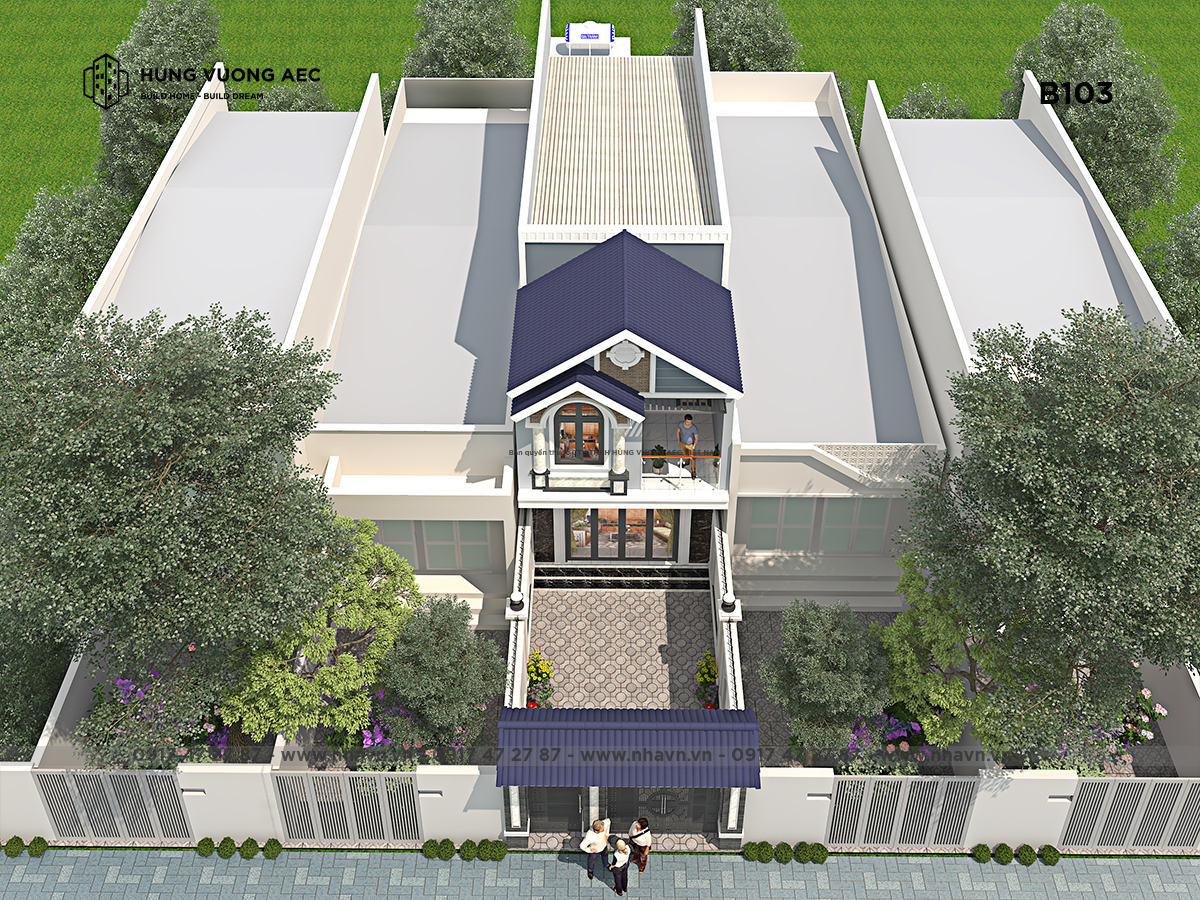 Hình khối công trình thể hiện sự kiên cố bền vững, tính thẩm mĩ lại được thể hiện rõ nét trong việc thiết kế và phối màu ngoại thất công trình. Màu xanh của mái thái đi cùng với màu trắng và màu đen, thiết kế màu gạch phía sân trước thể hiện sự ăn khớp theo đúng cấp độ và bánh xe màu sắc.