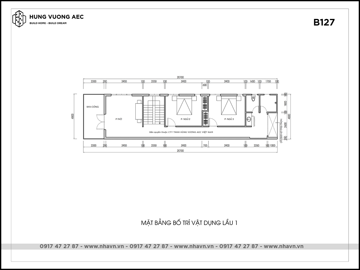 Công năng lầu 1 bố trí 2 phòng ngủ, phòng thờ, nhà vệ sinh dùng chung, và ban công.