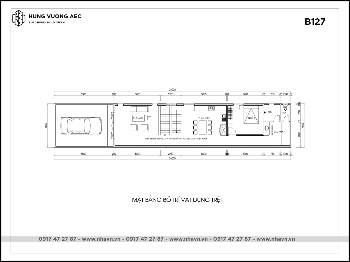 Lầu trệt được thiết kế sân trước có tiểu cảnh và khu vực để xe, tiếp đến là phòng khách đặt sát cửa chính, bên trong là không gian phòng bếp và khu vực ăn uống của gia đình, nhà vệ sinh chung, và sát bên là không gian phòng ngủ cùng hướng ra sân sau nhà.
