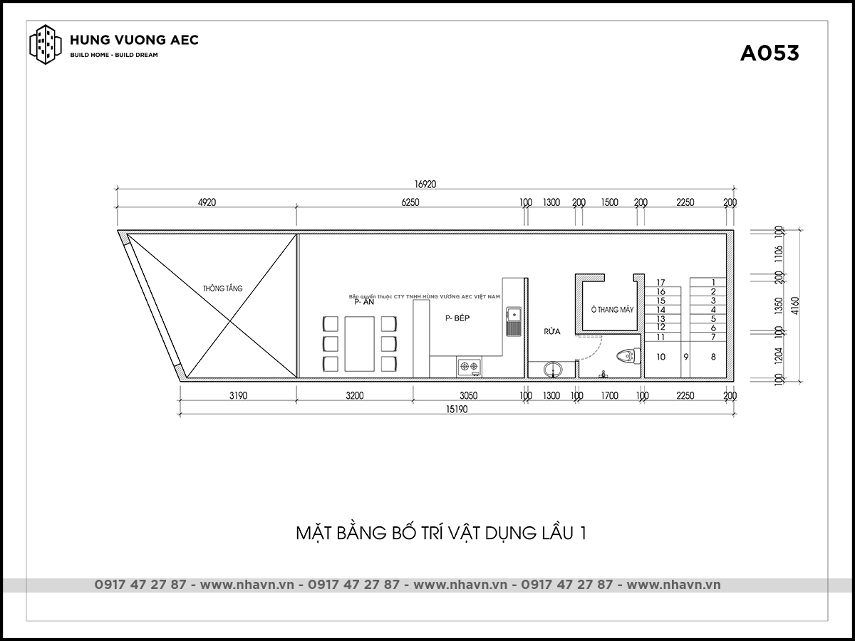 Lầu 1 gồm phòng ăn, phòng bếp và ô thang máy.
