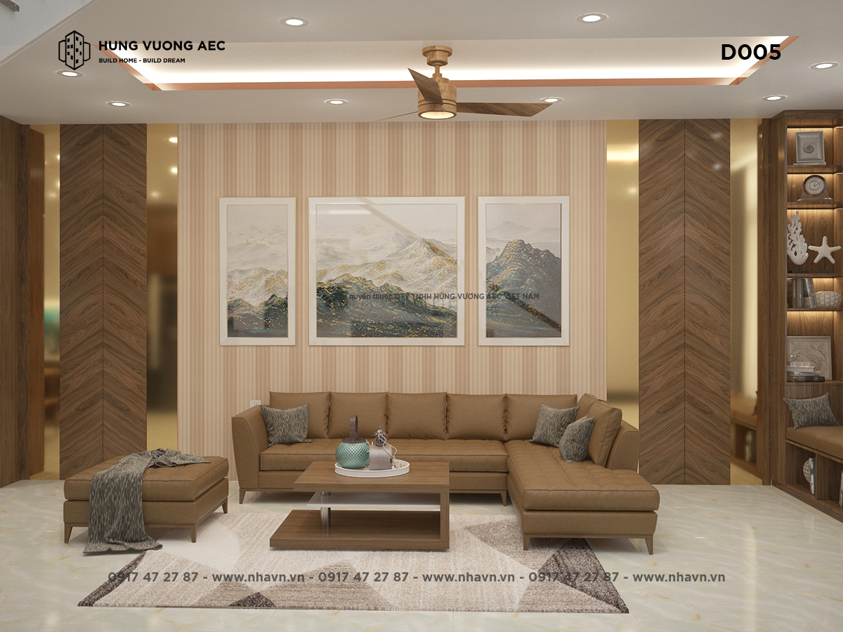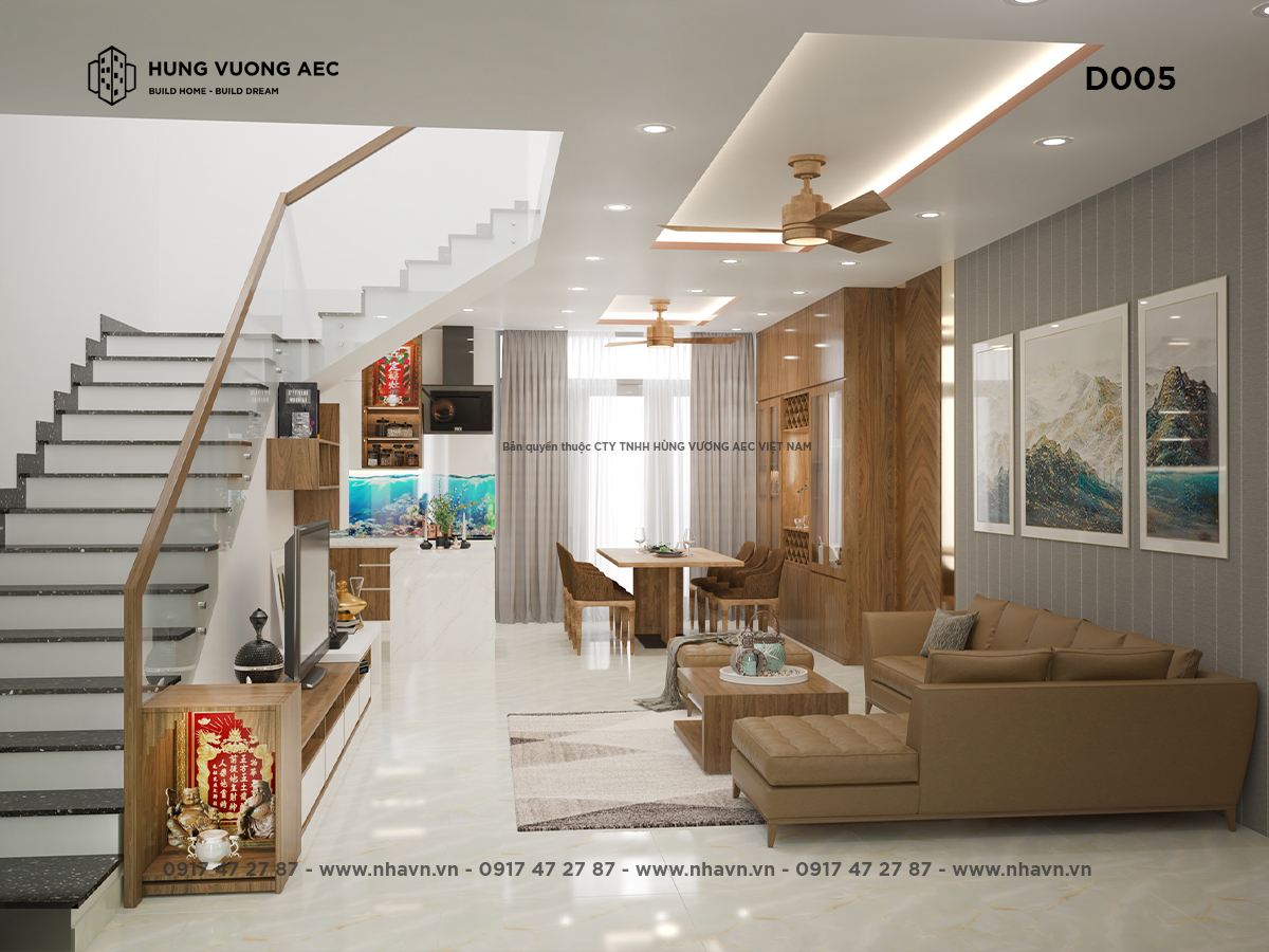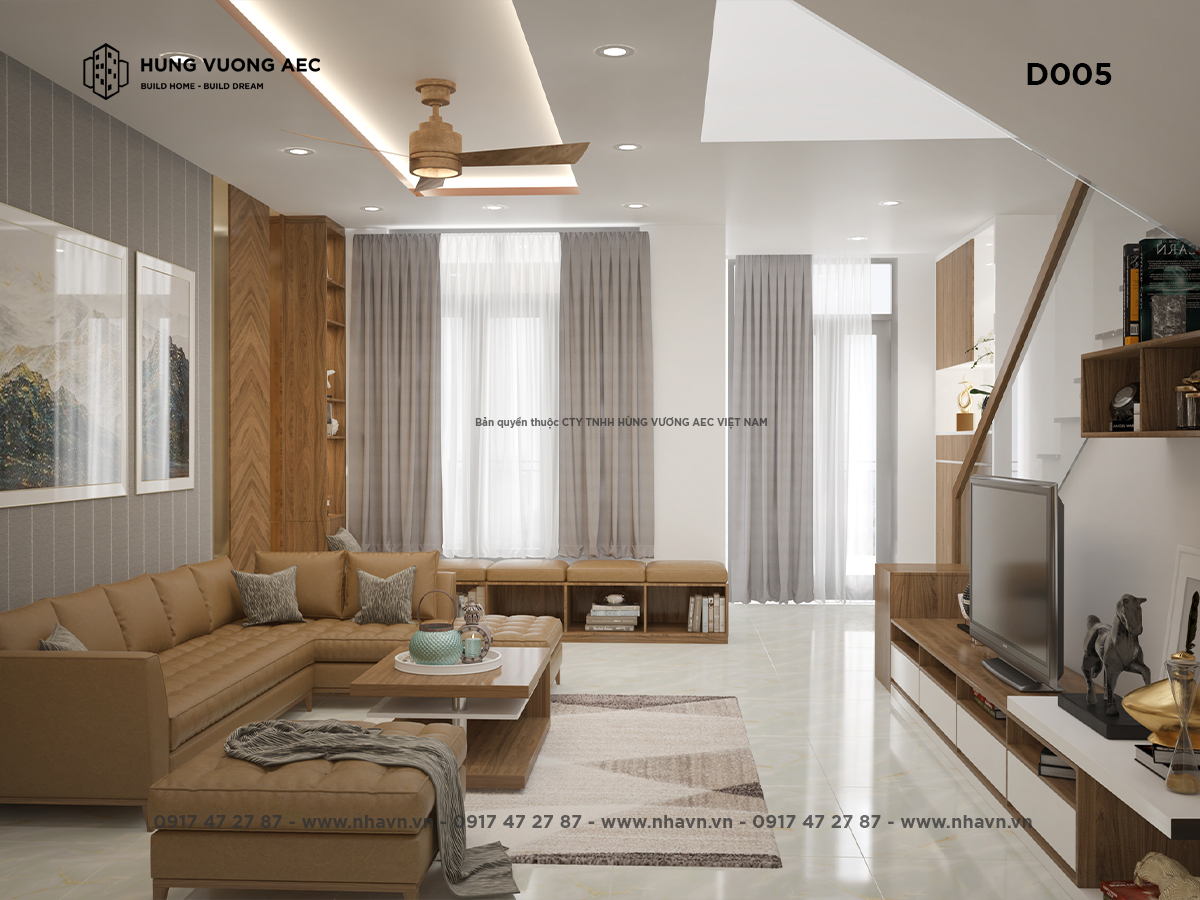 Tập trung nhiều vào tính năng, nên kiểu dáng nội thất trong phong cách hiện đại được tinh gọn một cách đáng kể, nhưng điểm đặc trưng tạo nên sự cuốn hút chính là phong thái tự do trong việc kết hợp màu sắc sáng tạo và nghệ thuật tạo điểm nhấn cực tinh tế. Những đặc trưng đó được áp dụng trong thiết kế phòng khách của căn nhà hiện đại này. Đồ nội thất trong phong cách thiết kế hiện đại được làm từ gỗ công nghiệp, kim loại, kính và bê tông. Những vật liệu này được chế tác từ công nghệ hiện đại, phù hợp với những tiêu chuẩn thiết kế hiện đại. Ngoài vật liệu, thiết kế của vật dụng nội thất là những hình khối cơ bản như vuông, chữ nhật, tròn với bề mặt sắc nét, không trang trí, không khắc viền, mỗi chi tiết đều được đơn giản hóa một cách tối đa để phù hợp với nhu cầu sử dụng. đem đến cho không gian phòng khách vẻ đẹp sang trọng, cao cấp.