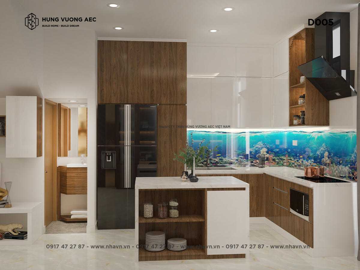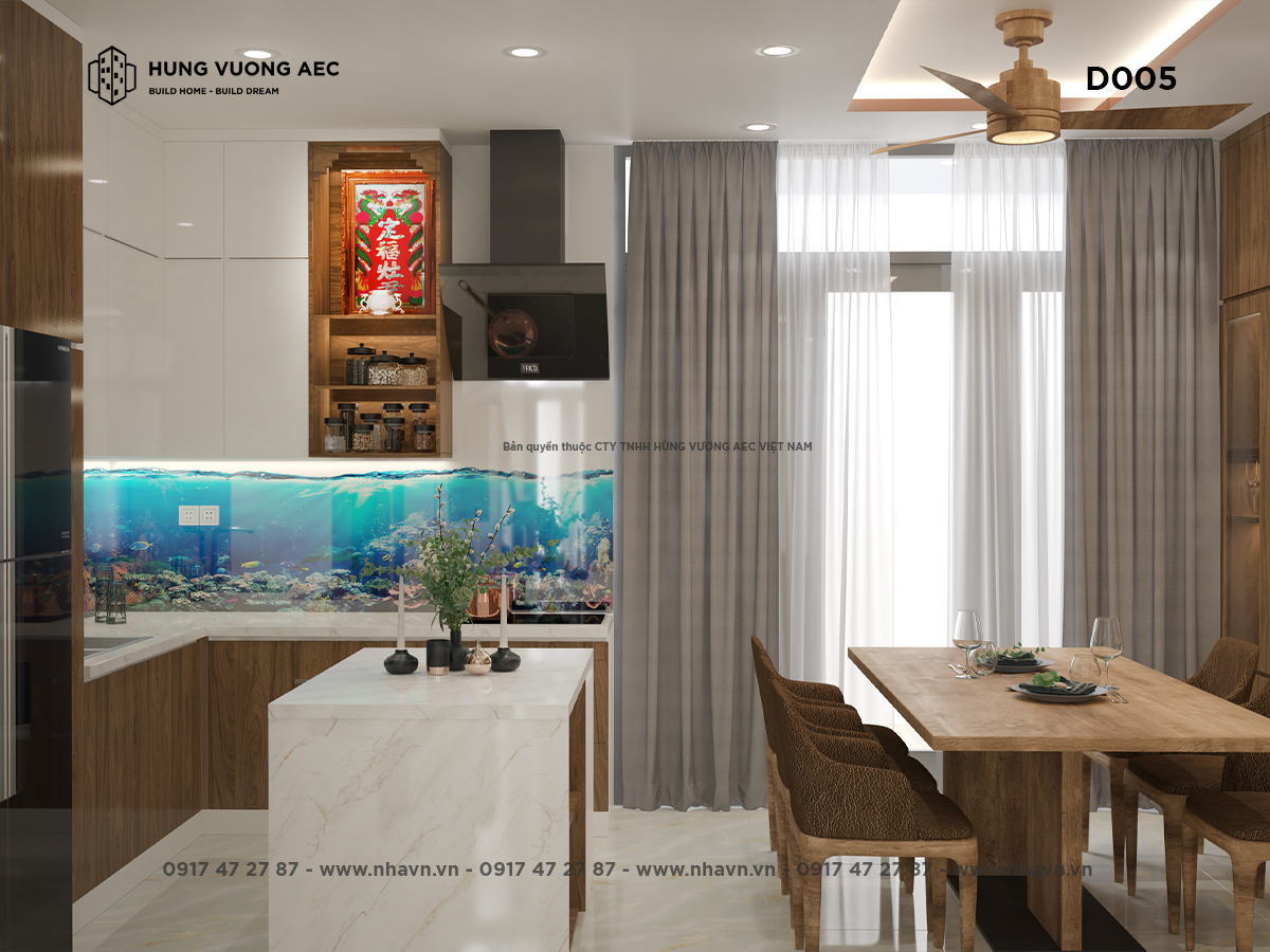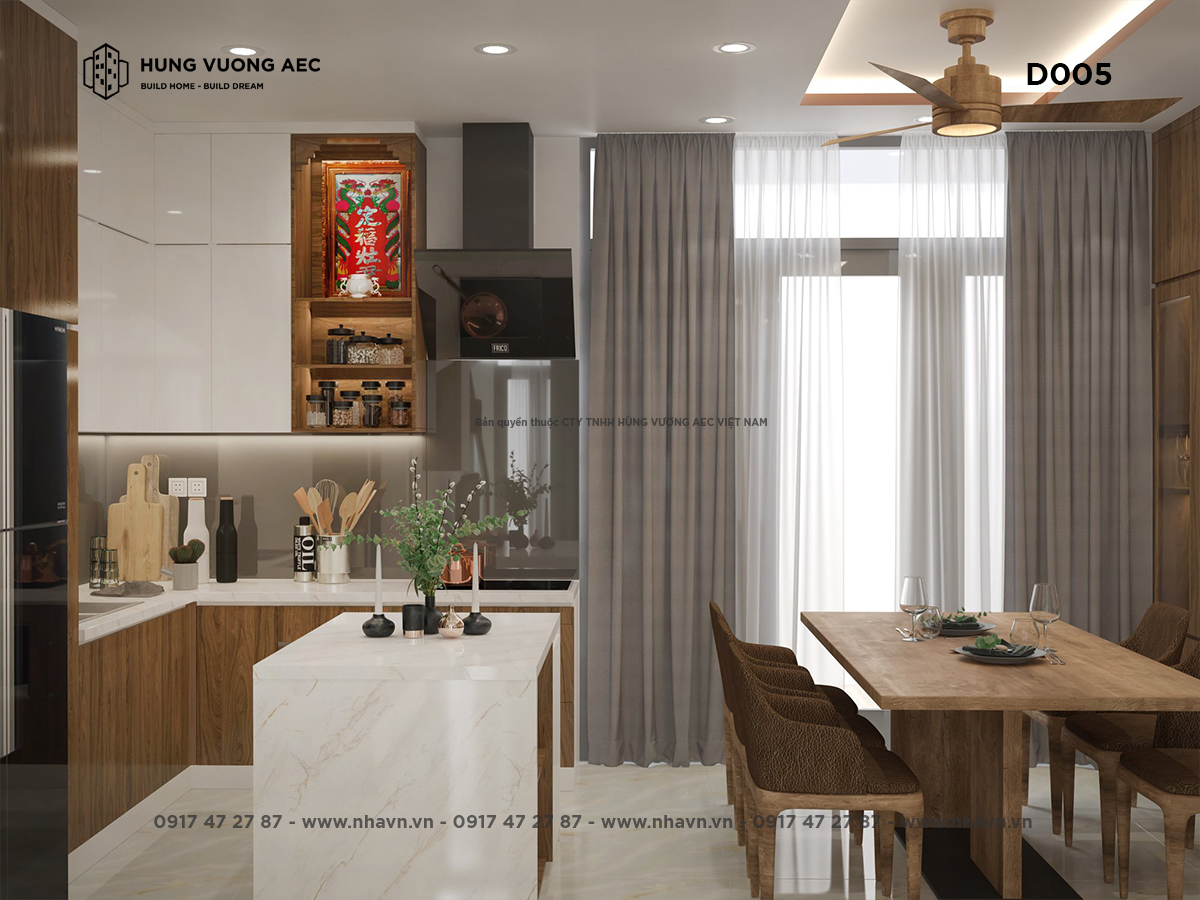 Phòng ăn, nhà bếp, và phòng khách được kết nối một cách hòa quyện và tinh tế, loại bỏ các cấu trúc không cần thiết trong nhà, mang đến một không gian sống rộng rãi, thoải mái và thoáng đãng hơn cho căn nhà. Thay vì sử dụng các vật liệu truyền thống, căn bếp được trang trí với những chiếc tủ và kệ từ gỗ, với công năng sử dụng được tối ưu. Các thiết bị trong phòng bếp đều được lựa chọn theo tiêu chí thiết kế đơn giản nhưng đáp ứng hoàn hảo các nhu cầu của gia chủ. Ánh sáng cho căn bếp và phòng ăn cũng tận dụng ánh sáng tự nhiên qua ô cửa lớn kết hợp với hệ thống đèn chiếu sáng hiện đại, tạo một nền sáng tinh tế, ấm cúng cho phòng ăn.
