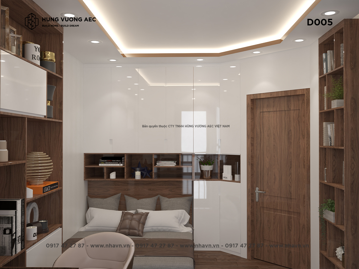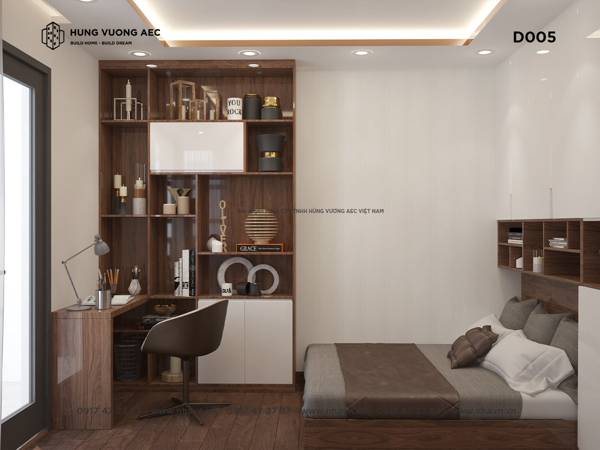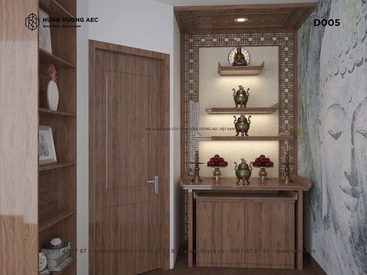 Mỗi căn phòng được thiết kế với tone màu trung tính như trắng và màu sắc tự nhiên của gỗ, kết hợp với những đường nét thiết kế theo hình khối cơ bản và cách bố trí vật dụng hợp lý tạo cảm giác rộng hơn cho căn phòng. Phòng thờ được thiết kế bên cạnh phòng ngủ được nối với nhau qua một lối đi nhỏ, giúp gia chủ thuận tiện hơn. Dù nằm bên góc của căn nhà nhưng phòng thờ được thiết kế để tối ưu hết không gian của mình, với bàn thờ và kệ được làm từ gỗ kết hợp với tường màu bê tông, làm tăng không gian cho căn phòng.