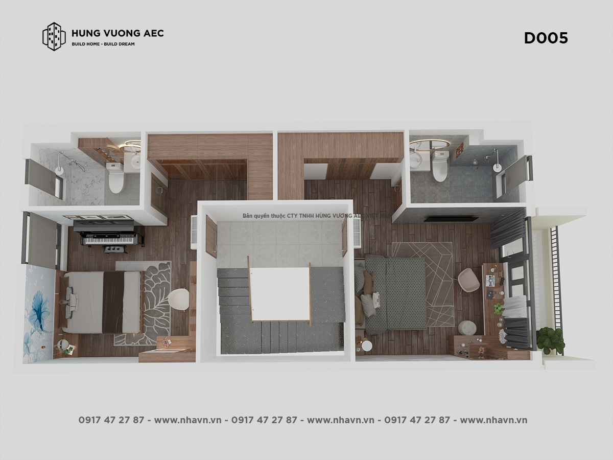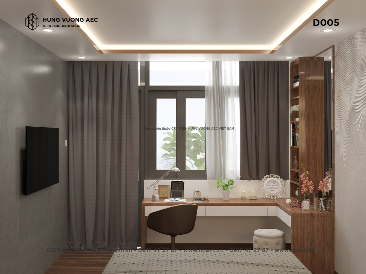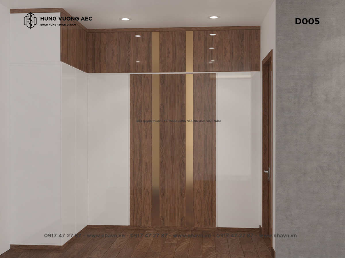 Mỗi căn phòng được thiết kế với tone màu trung tính như trắng và màu sắc tự nhiên của gỗ, kết hợp với những đường nét thiết kế theo hình khối cơ bản và cách bố trí vật dụng hợp lý tạo cảm giác rộng hơn cho căn phòng. Phòng thờ được thiết kế bên cạnh phòng ngủ được nối với nhau qua một lối đi nhỏ, giúp gia chủ thuận tiện hơn. Dù nằm bên góc của căn nhà nhưng phòng thờ được thiết kế để tối ưu hết không gian của mình, với bàn thờ và kệ được làm từ gỗ kết hợp với tường màu bê tông, làm tăng không gian cho căn phòng.