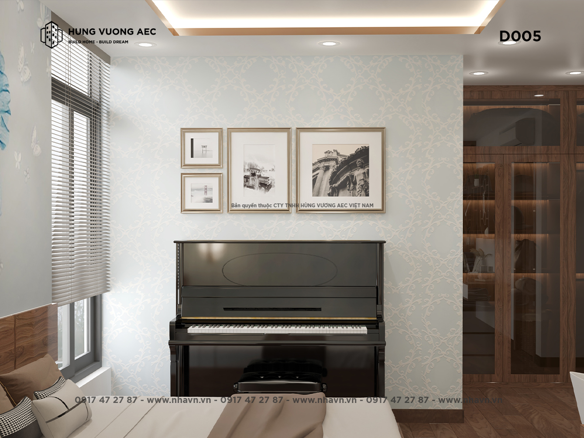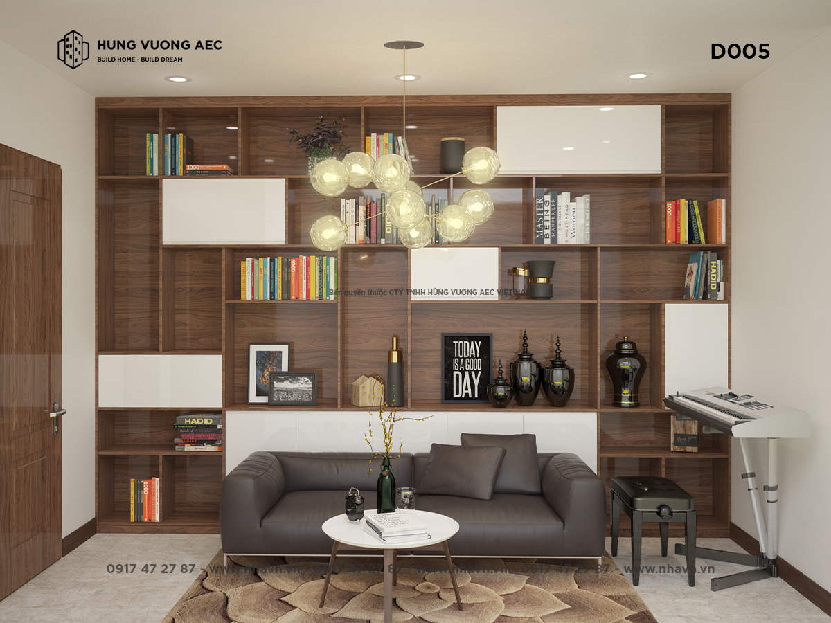 Phòng sinh hoạt chung mang thiết kế hiện đại với đèn trang trí tinh tế, tạo điểm nhấn bằng ánh sáng cho khu vực quây quần của gia đình. Kệ gỗ lớn đặt sát với tường, vừa là một điểm nhấn trong thiết kế vừa đóng vai trò quan trọng để cất giữ những kỉ niệm của gia đình cũng như làm kệ sách. Phòng sinh hoạt chung cũng được đặt ở tầng 2, tách biệt ra khỏi phòng khách nhằm tăng tính riêng tư cho khu vực này. Căn phòng cũng được trang bị đàn piano để phục vụ cho nhu cầu giải trí của các thành viên trong gia đình. Các kiến trúc sư cũng đặt những món đồ nội thất có hình dáng sáng tạo, độc đáo để đem đến nét sinh động, tránh cảm giác nhằm chán, đơn điệu cho căn phòng.