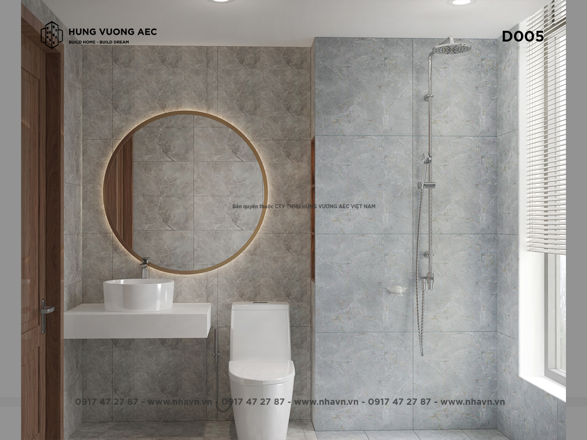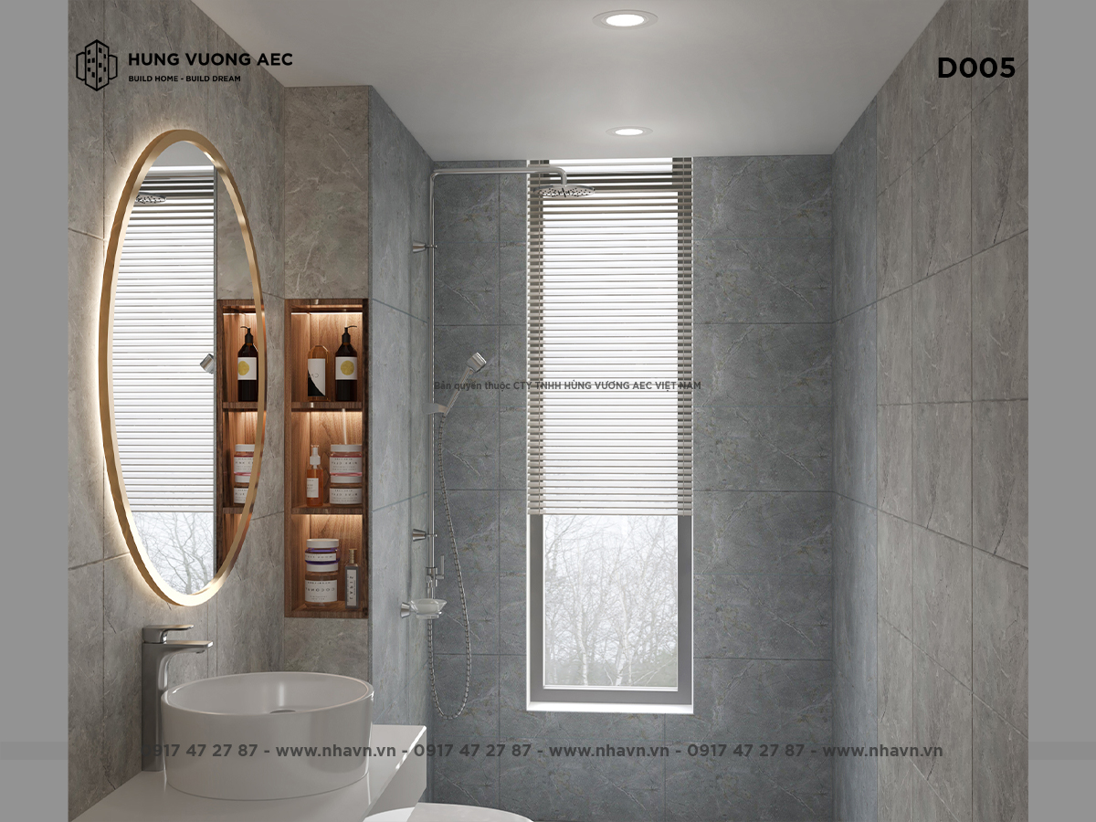 Phòng tắm từ lâu không chỉ là công trình phụ mà được xem là một phần quan trọng nhất của căn nhà. Các kiến trúc sư đã dùng đá tự nhiên tone màu xám để trang trí, tone màu trắng của nền và các vật dụng bằng sứ, kết hợp với ánh sáng tự nhiên từ cửa sổ làm không gian phòng tắm tinh tế hơn và đem lại cảm giác thoáng đãng hơn. Các bức tường cũng được tận dụng với các hộc tủ để đồ ẩn bên trong giúp tiết kiệm không gian. Điểm nhấn của phòng tắm là chiếc gương tròn không viền với hệ thống đèn LED bao quanh, vừa mang tính trang trí vừa kết hợp với ánh sáng tự nhiên đem lại cho căn phòng ánh sáng thư giãn, thoải mái.