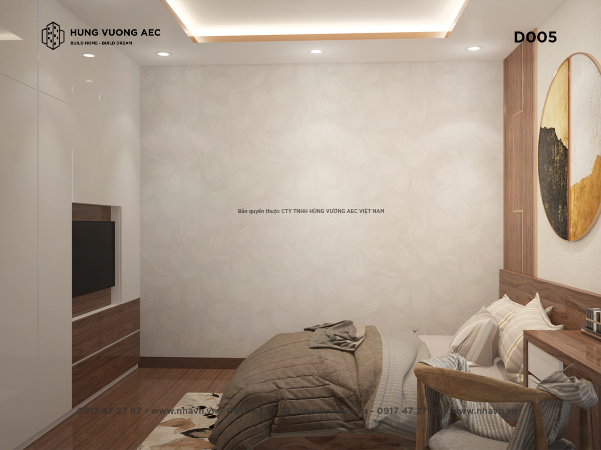 Dù phòng ngủ với diện tích lớn hay nhỏ, phong cách thiết kế hiện đại của căn nhà cho phép cá nhân hóa các chi tiết của căn phòng, thể hiện cá tính, sở thích và thói quen của chủ nhân. 4 phòng ngủ của căn nhà đều được thiết kế theo ý tưởng của gia chủ, với những đường nét vuông vức, gọn gàng và mạch lạc tạo nên sự chặt chẽ trong việc bố trí đồ nội thất, tạo nên sự thoáng đãng và thoải mái cho không gian nghỉ ngơi, thư giãn. Ánh sáng cũng là một yếu tố được cân nhắc kỹ lưỡng khi thiết kế phòng ngủ của căn nhà. Việc dùng các ô cửa kính lớn đem ánh sáng tự nhiên vào không gian phòng ngủ, kết hợp với hệ thống chiếu sáng được tính toán kỹ lưỡng, tạo một không gian ấm cúng, hài hòa với thiên nhiên.