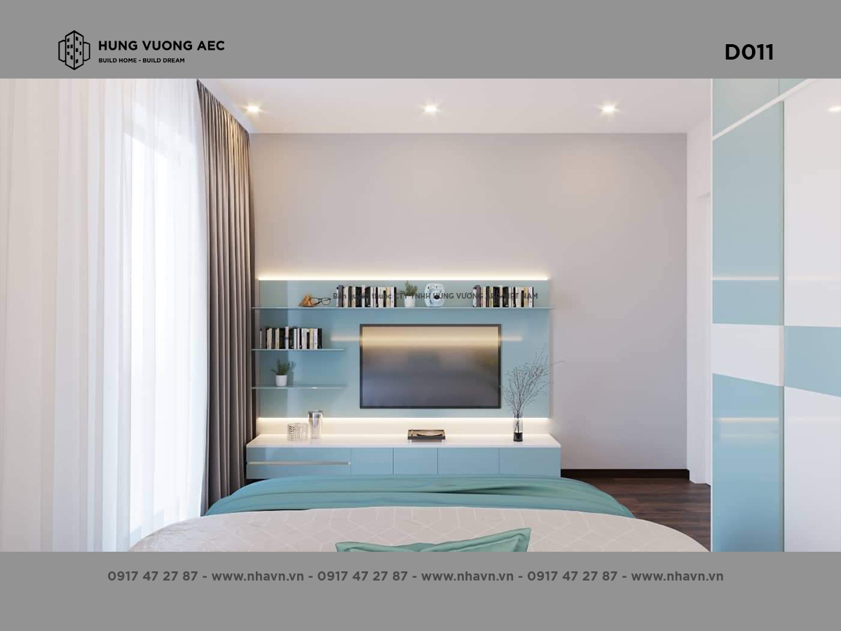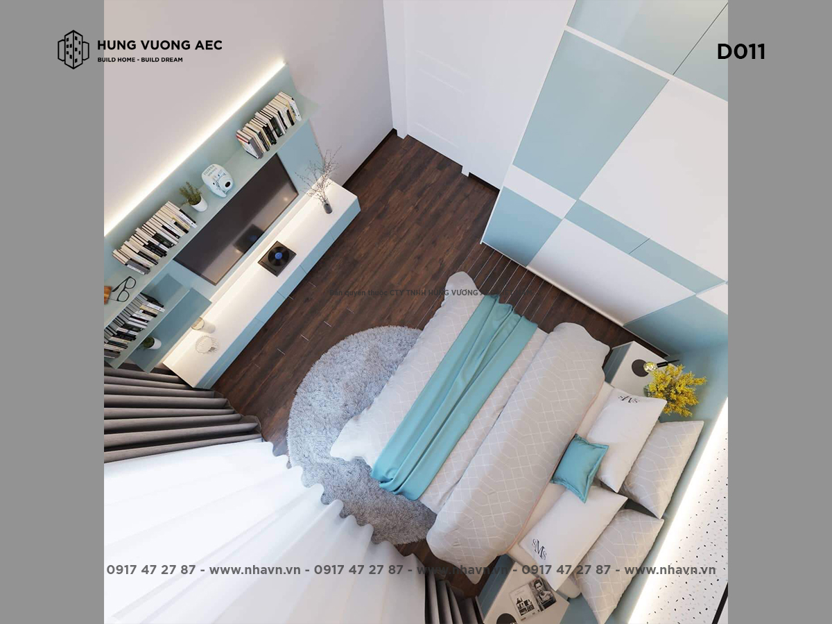 Giường ngủ được thiết kế đơn giản với sắc xanh chung của căn phòng được đặt cạnh ô cửa lớn nhằm tận dụng ánh sáng bên ngoài.