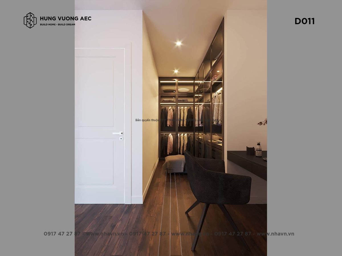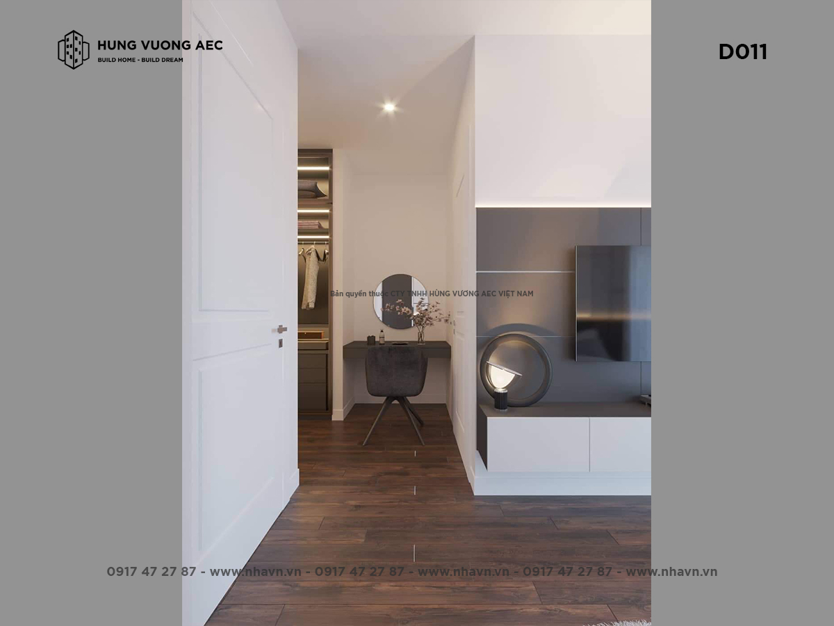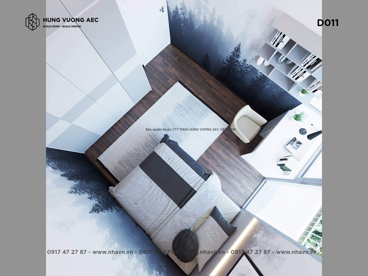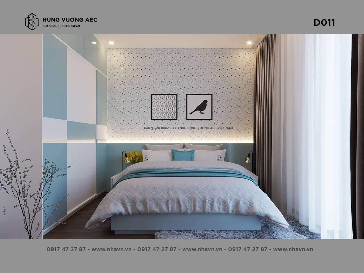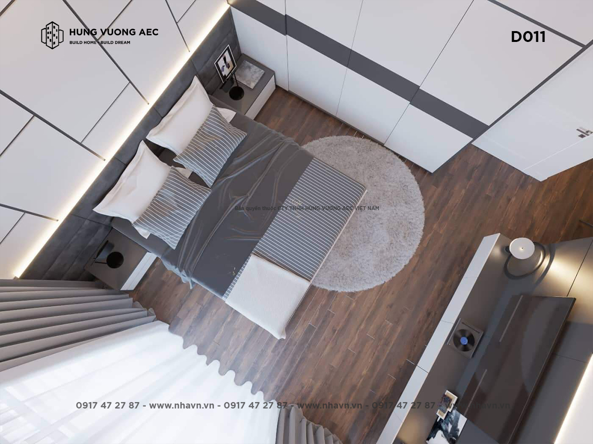 Phòng ngủ Master được thiết kế với sự kết hợp đầy tinh tế của gam màu trắng của vách ngăn đầu giường kết hợp với những đường kẻ tối màu, phân cách mảng tường thành những ô vuông nhỏ, tạo một điểm nhấn cho căn phòng. Phòng ngủ cũng được thiết kế với một ô cửa lớn, với hệ thống rèm che giúp gia chủ có thể chủ động điều chỉnh ánh sáng tự nhiên vào căn phòng của mình, kết hợp với những bóng đèn LED được bố trí khắp phòng đem lại cho căn phòng một nguồn sáng cân bằng, tự nhiên. Đồ nội thất của căn phòng cũng được lựa chọn và thiết kế tỉ mẩn, hài hòa với tổng thể căn phòng mà vẫn giữ được giá trị sử dụng của mình.