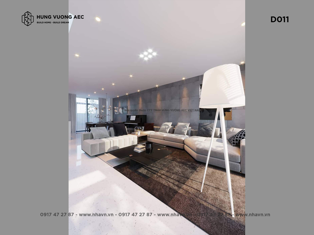 Tổng thể căn phòng với những gam màu trung tính, hiện đại với điểm nhấn tương phản là tấm thảm màu nâu. Những gam màu trung tính như trắng, nâu, xám đem lại một vẻ sang trọng và làm không gian của căn phòng rộng hơn thực tế. Đồ nội thất của phòng khách cũng được thiết kế, lựa chọn tỉ mỉ, cẩn thận để không phá đi sự liền mạch trong thiết kế của phòng khách. Những đường nét thiết kế đơn giản là sự két hợp của những hình khối cơ bản làm cho những vật dụng như bàn, tủ đứng và tủ TV rất hài hòa với vẻ đẹp tối giản của căn nhà. Đi kèm với đó là những vật dụng mang tính nghệ thuật cao như chiếc đèn trang trí với chân được làm cao, vừa giúp bổ sung thêm ánh sáng vừa tăng tính thẩm mỹ cho căn phòng.