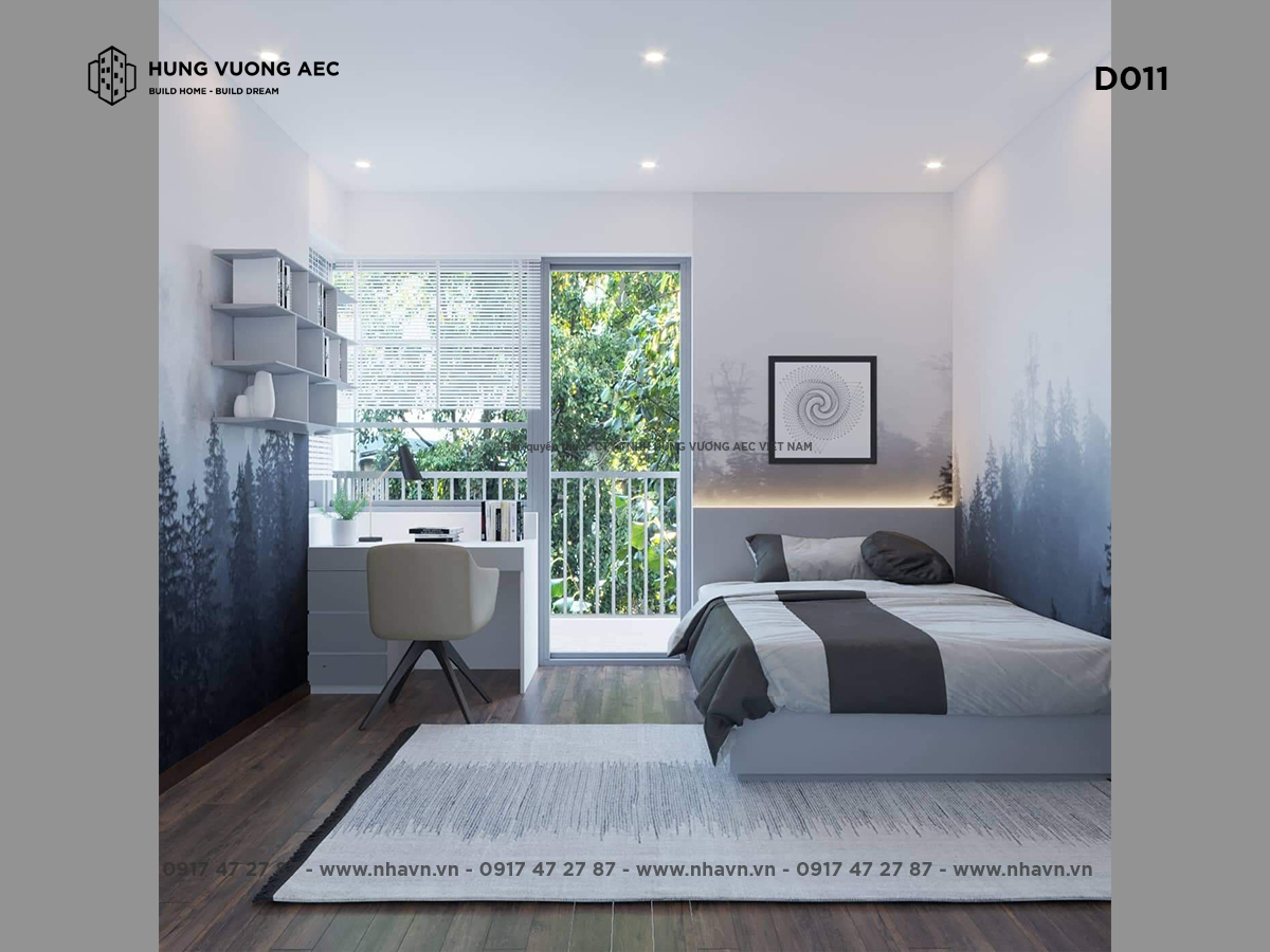 Phòng ngủ 2 được thiết kế với một không gian mở để chủ nhân có thể tận hưởng được mảng xanh từ bên ngoài. Thiết kế mở cho phép ánh sáng tự nhiên tràn vào căn phòng. Những mảng tường của phòng ngủ được trang trí với tranh dán tường do chính gia chủ chọn. Thiết kế nội thất mang xu hướng hiện đại, tuân theo những quy tắc tối giản và những đường nét vuông vức. Bàn làm việc được thiết kế từ gỗ công nghiệp sơn trắng với kích thước nhỏ nhưng lại có công năng sử dụng tối đa khi tận dụng được nguồn sáng từ bên ngoài.