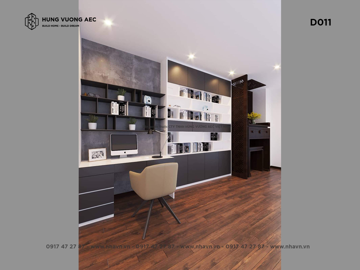 Bàn làm việc được đặt trên tầng 2 của căn nhà giúp gia chủ có thể tập trung tuyệt đối vào công việc của mình. với thiết kế đơn giản, các kiến trúc sư đã chọn màu sơn bê tông làm gam màu chủ đạo cho khu vực làm việc tạo sự tương phản với màu sắc xung quanh. Kệ gỗ với thiết kế thanh mảnh giúp không gian được tận dụng tối đa và kết hợp những vật dụng trang trí nhỏ nhắn nhưng tinh tế. Sự xuất hiện của những chậu câu xanh làm không gian gần gũi hơn với thiên nhiên, góp phần giải tỏa căng thẳng khi làm việc.