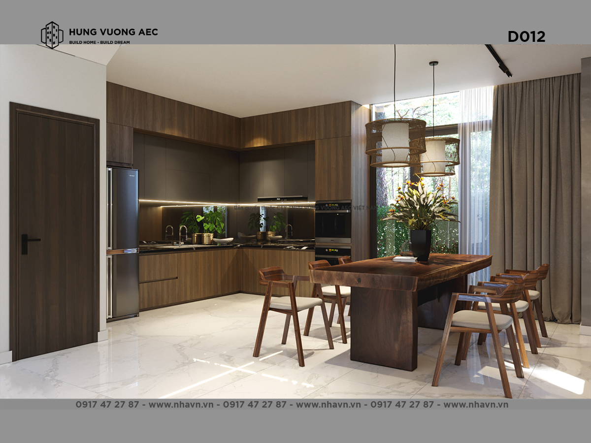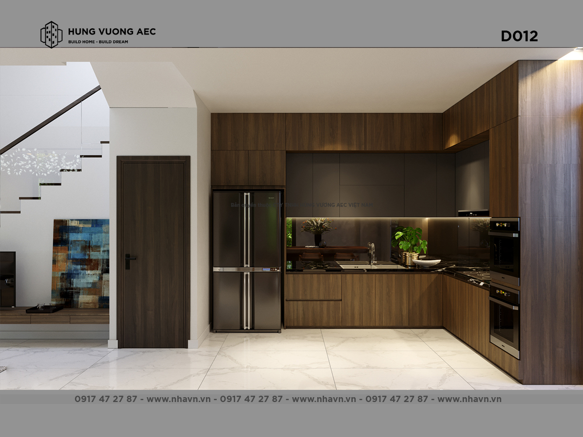 Màu sắc của căn bếp cũng được lựa chọn sao cho hài hoài nhất với tổng thể căn nhà. Những chiếc tủ bếp chữ L và tủ treo đều được thiết kế từ gỗ với màu nâu trầm tinh tế, vừa mang lại vẻ đẹp hiện đại cho căn bếp vừa tăng không gian chứa các vật dụng cần thiết. Là một căn bếp hiện đại thế nên không thể thiếu những trang thiết bị hiện đại với thiết kế đầy tính thẩm mỹ và nhiều công năng khác nhau. những trang thiết bị như tủ lạnh, đèn LED, lò nướng, máy hút mùi đều được chọn những loại chó chất lượng cao nhất, giúp trải nghiệm nấu ăn của gia chủ được nâng lên tầng cao mới.