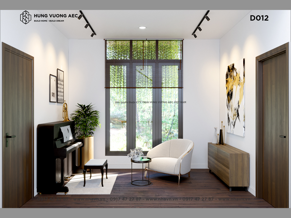 Phòng sinh hoạt chung cho cả gia đinh với cây xanh, đàn piano và những vật dụng trang trí phong thủy tỉ mỉ, hiện đại.