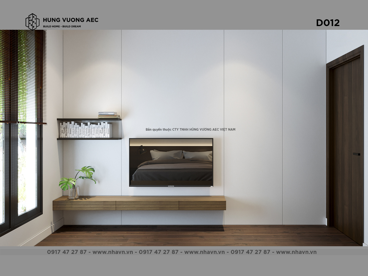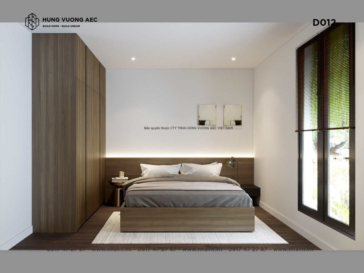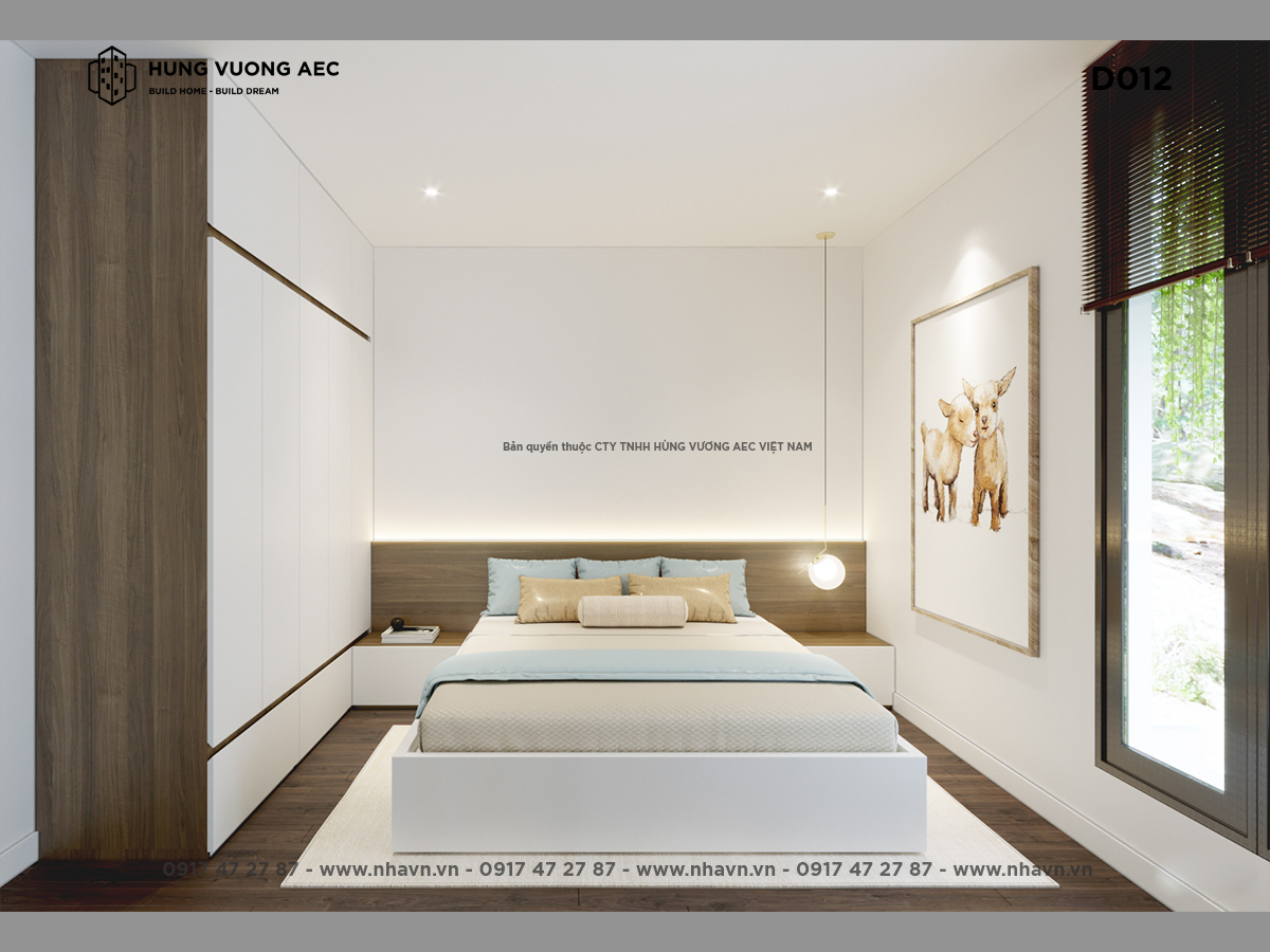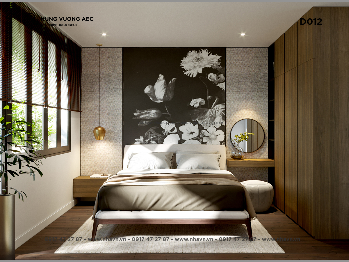 Thiết kế phòng ngủ 1 của căn nhà là hiện thân của tư duy thiết kế hiện đại với những đường nét đơn giản nhưng không đơn điệu, uyển chuyển nhưng không quá cầu kì. Căn phòng được thiết kế với một cửa sổ lớn nhằm tận dụng ánh sáng và luồng không khí tự nhiên. Điểm nhấn của căn phòng chính là vách đầu giường với kết cấu và màu sắc độc đáo, làm điểm tựa cho bức tranh phong thủy đầy tinh tế.