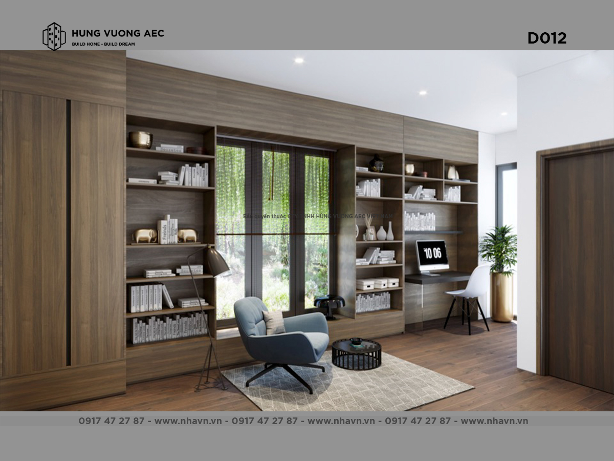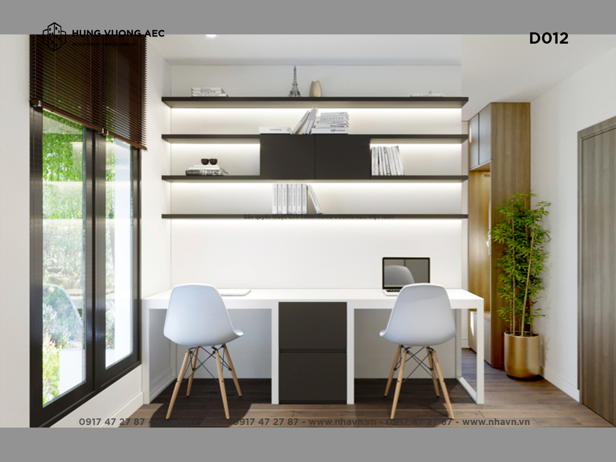 Bàn làm việc với thiết kế lấy gam màu trắng chủ đạo giúp gia chủ tập trung vào công việc. Hệ thống đèn LED hiện đại được giấu sau kệ sách đem lại nguồn ánh sáng thích hợp khi làm việc vào ban đêm khi không còn tận dụng được ánh sáng tự nhiên.