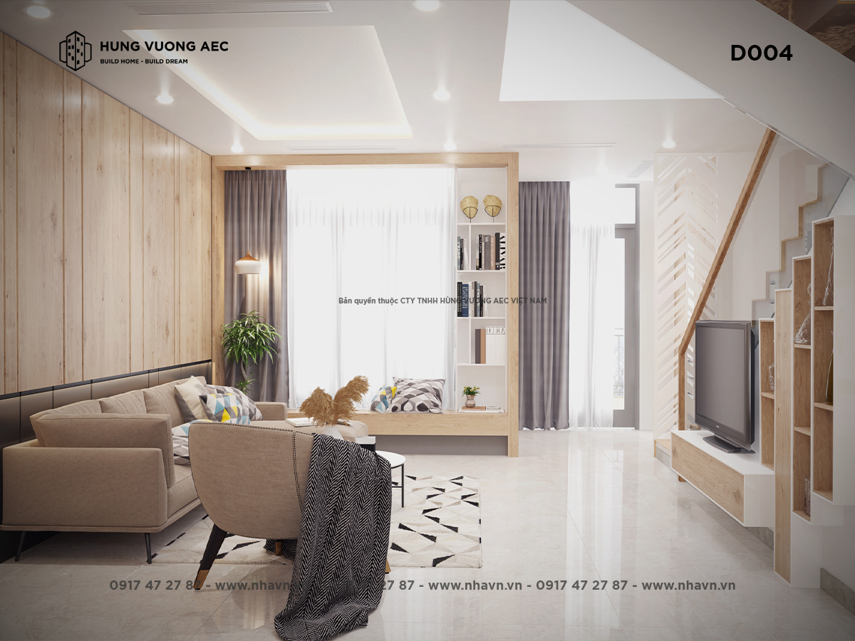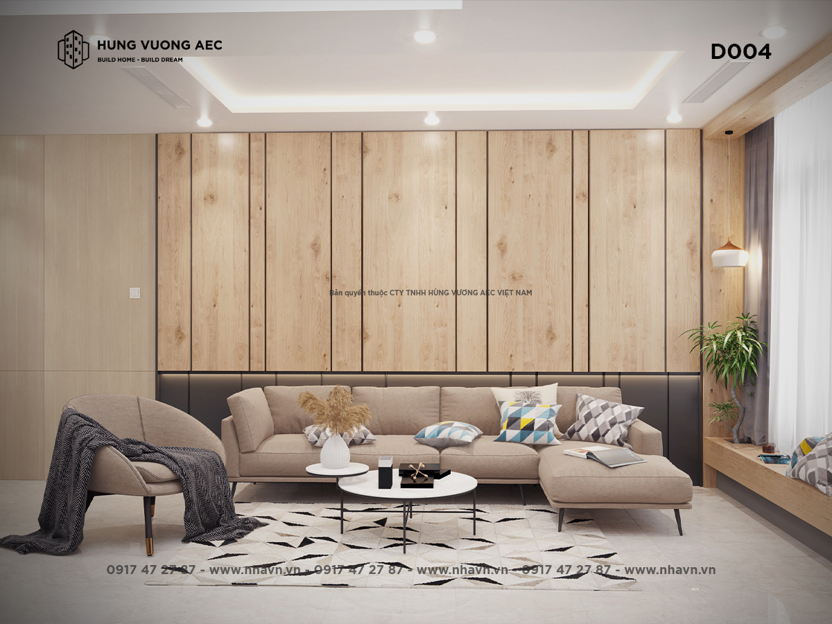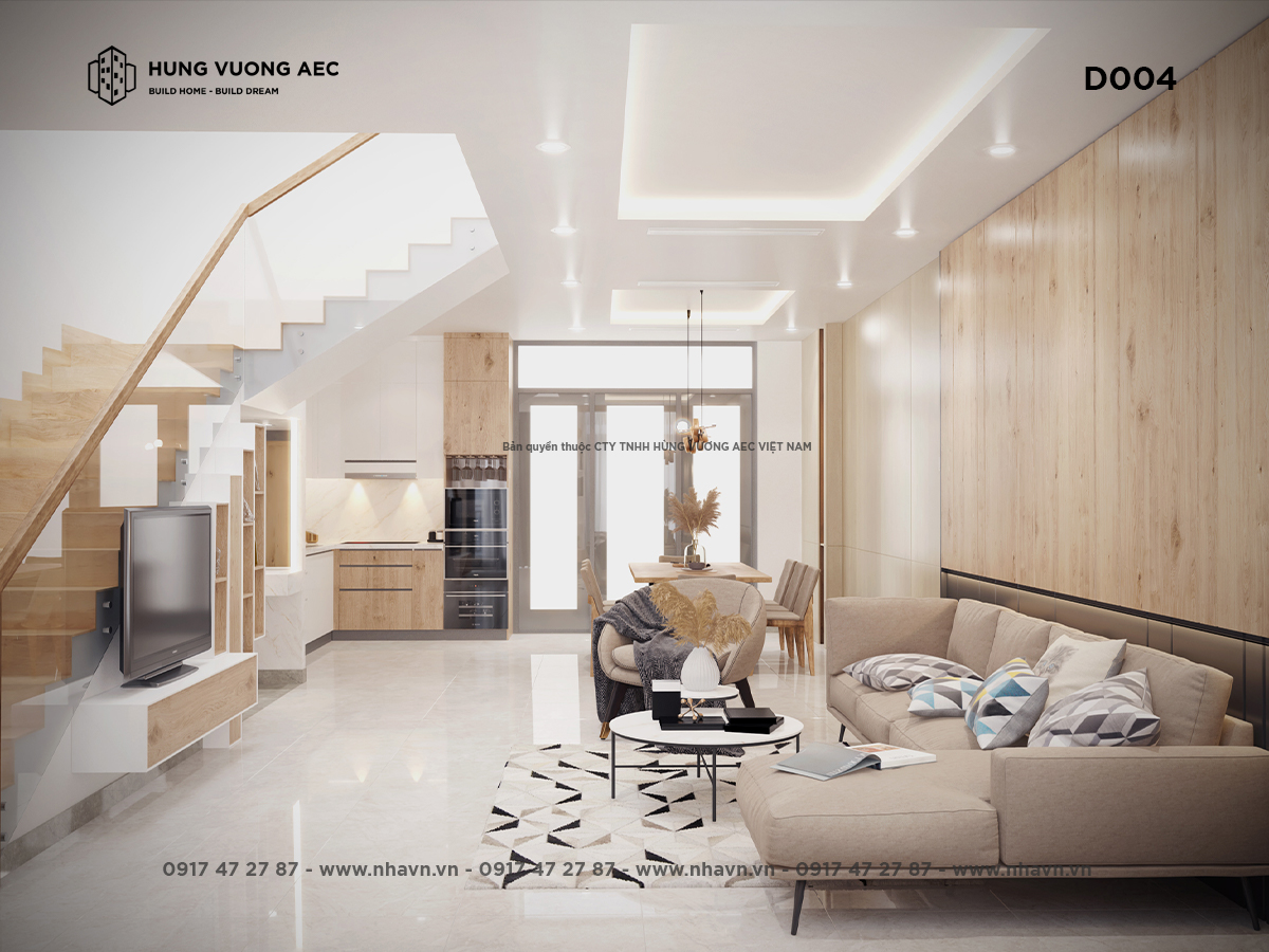 Phòng khách được xem như là bộ mặt của căn nhà khi được dùng làm nơi tiếp đón khách cũng như khu vực giải trí của các thành viên trong gia đình. Với thiết kế hiện đại, phòng khách của căn nhà lấy tone màu chủ đao là trắng và màu gỗ tự nhiên đem lại sự tinh tế cho căn phòng. Đi cùng với màu sắc đơn giản, trung tính, đồ nội thất cũng được thiết kế đơn giản, không có quá nhiều chi tiết thừa nhằm tối ưu hóa công năng cũng như chi phí.