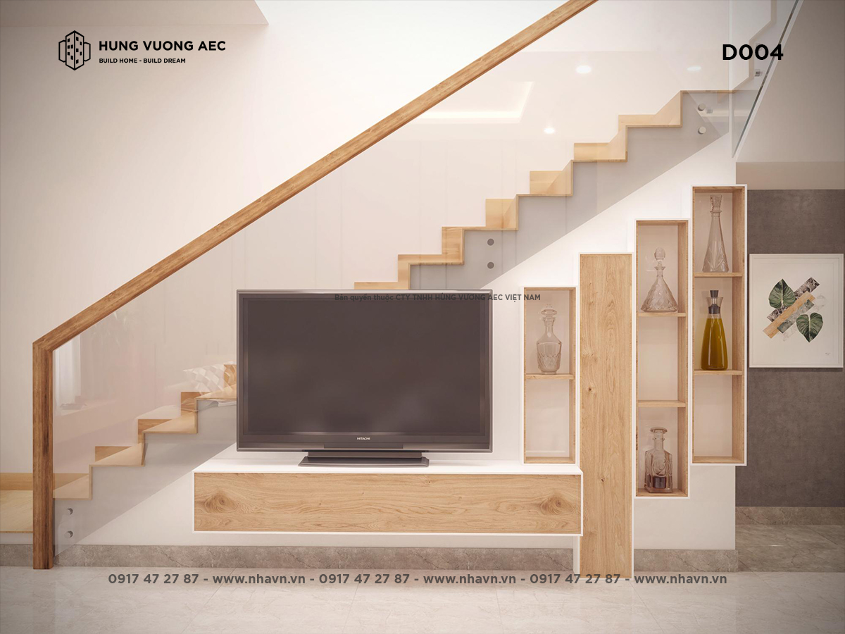 Kệ TV và kệ đựng đồ trang trí bằng gỗ được đặt dưới chân cầu thang nhằm tiết kiệm không gian