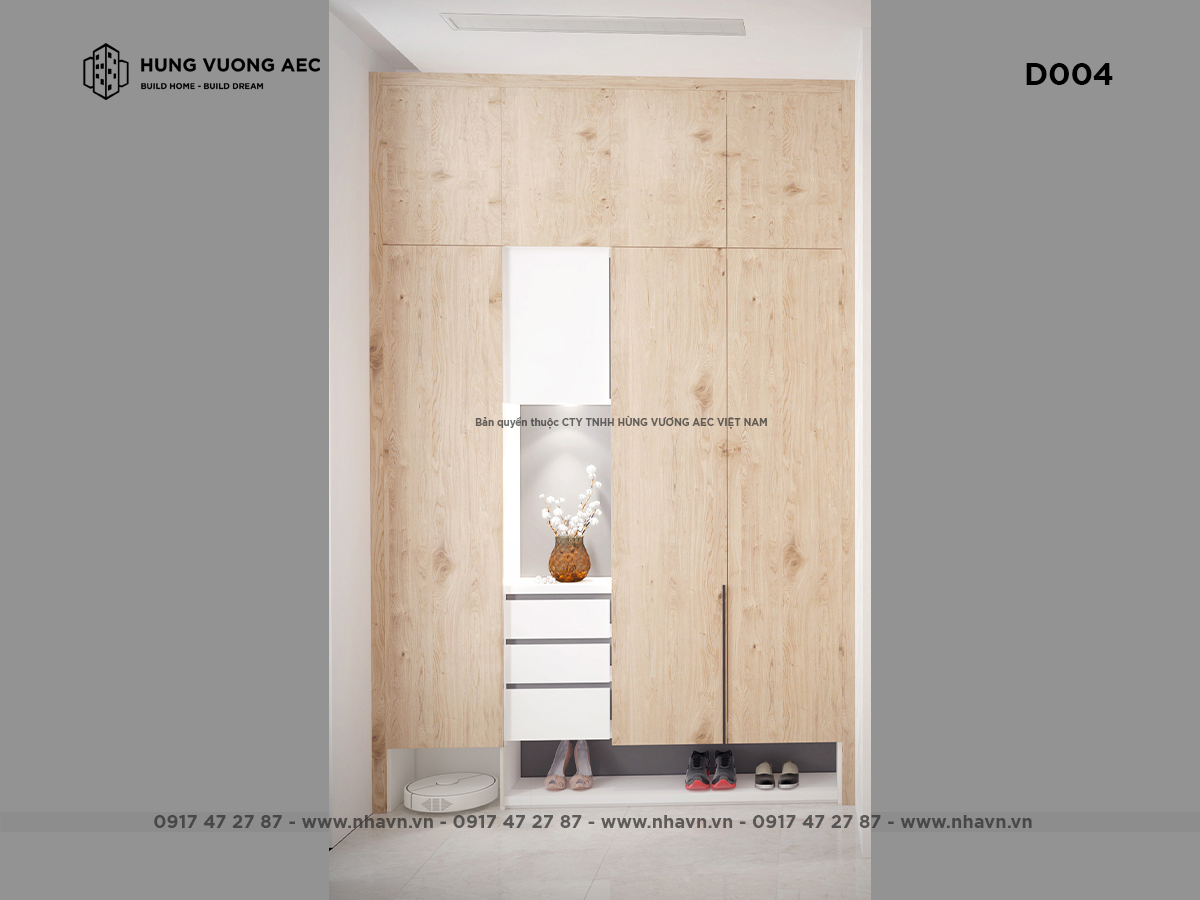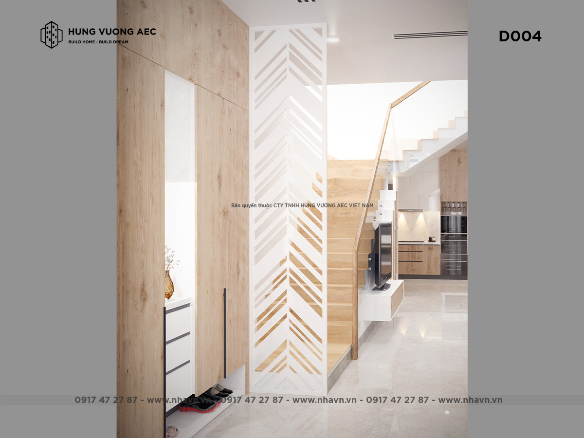 Tủ để đồ bằng gỗ được thiết kế tối giản đặt cạnh cầu thang, thuận tiện trong quá trình sử dụng. Thay vì sử dụng một bức ngăn đơn điêu, thiết kế có phần phá cách của bức ngăn làm tăng tính thẩm mĩ cho phòng khách.