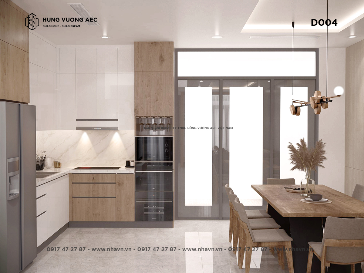 Phòng bếp được thiết kế thông với phòng khách, đem lại sự liền mạch cho căn nhà. Mang chung một ngôn ngữ thiết kế hiên đại, căn bếp cũng được lựa chọn những chất liệu tự nhiên như gỗ, kết hợp với các chất liệu đặc trưng của phong cách hiện đại như nhôm, kính, thép làm tăng vẻ đẹp cho căn bếp, nơi giữ lửa gia đình.