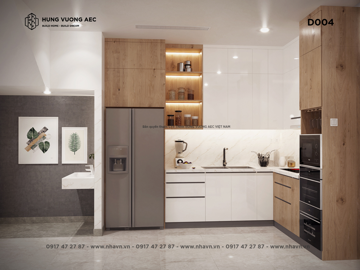 Tủ bếp được thiết kế bởi những đường nét đơn giản, gọn gàng, vuông vắn tập trung vào công năng sử dụng chứa được nhiều đồ dùng nhà bếp cần thiết tạo không gian thoáng đãng, thuận tiện khi nấu nướng.