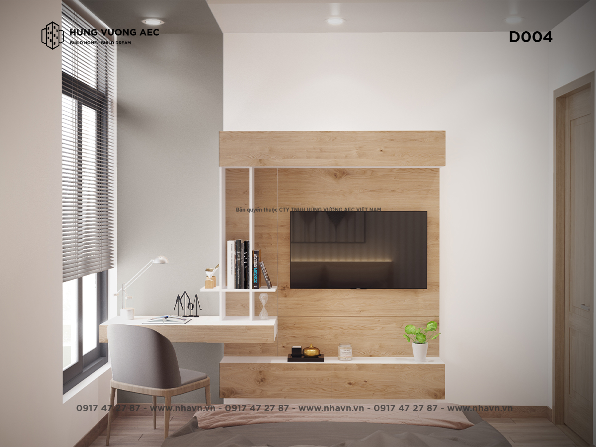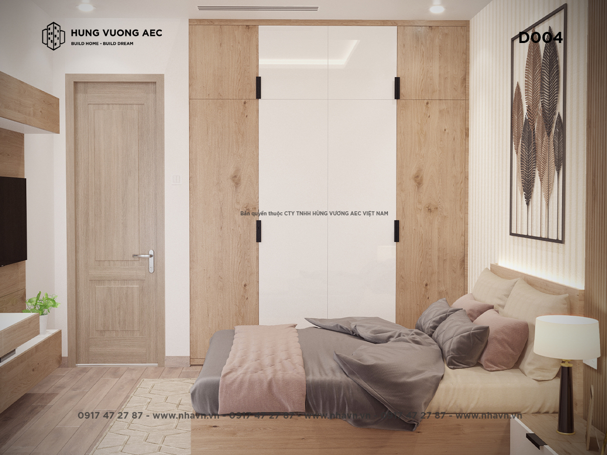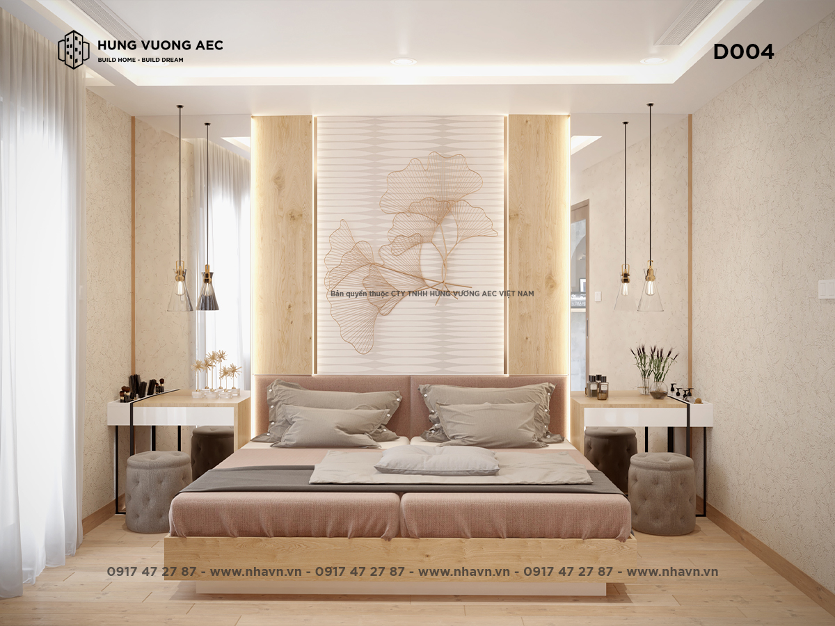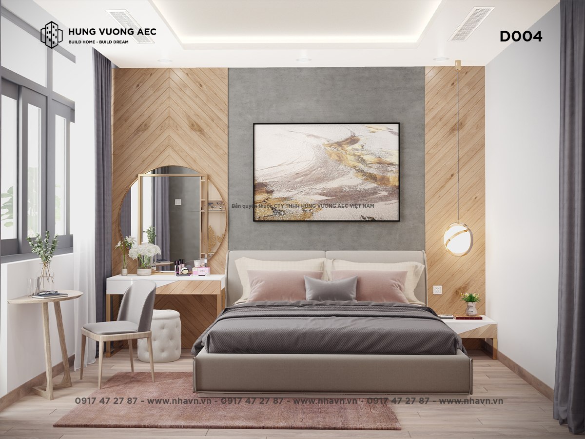 Phòng ngủ 3 của căn nhà cũng không nằm ngoài phong cách thiết kế hiện đại. Các kiến trúc sư sử dụng gỗ làm vật liệu chủ đạo cho phòng ngủ, kết hợp cùng với họa tiết giấy dán tường đơn giản nhưng tạo nên một không gian tinh tế, hài hòa. Bức tranh trừu tượng được đặt trên vách ngăn đầu giường làm bằng gỗ, tránh sự đơn điệu cho căn phòng. Ngoài ra, hai bàn trang điểm được ánh sáng từ đèn treo tinh tế hỗ trợ, đem lại công năng sử dụng tốt nhất và thiết kế đẹp nhất cho căn phòng.