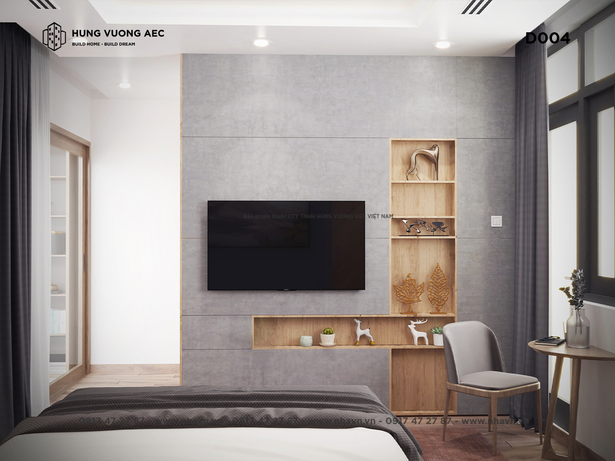 Tủ đồ được tận dụng làm vách ngăn và giá treo TV với tone màu xi măng tối giản. Phía trước là hộc để trang trí, phía sau là tủ đồ được sơn trắng, làm vách ngăn đến một không gian thư giãn nhỏ hơn.