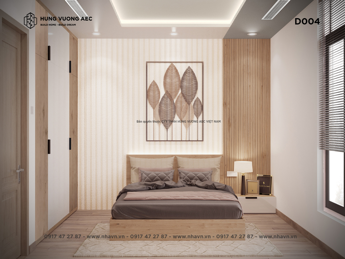 Phòng ngủ 2 sử dụng giường gỗ vuông vức cỡ lớn cùng tone màu với toàn bộ căn phòng. Vách tường đầu giường không còn đơn điệu, nhàm chán khi được trang tri với tranh mộc và các thanh gỗ xếp dọc môt cách tinh tế.