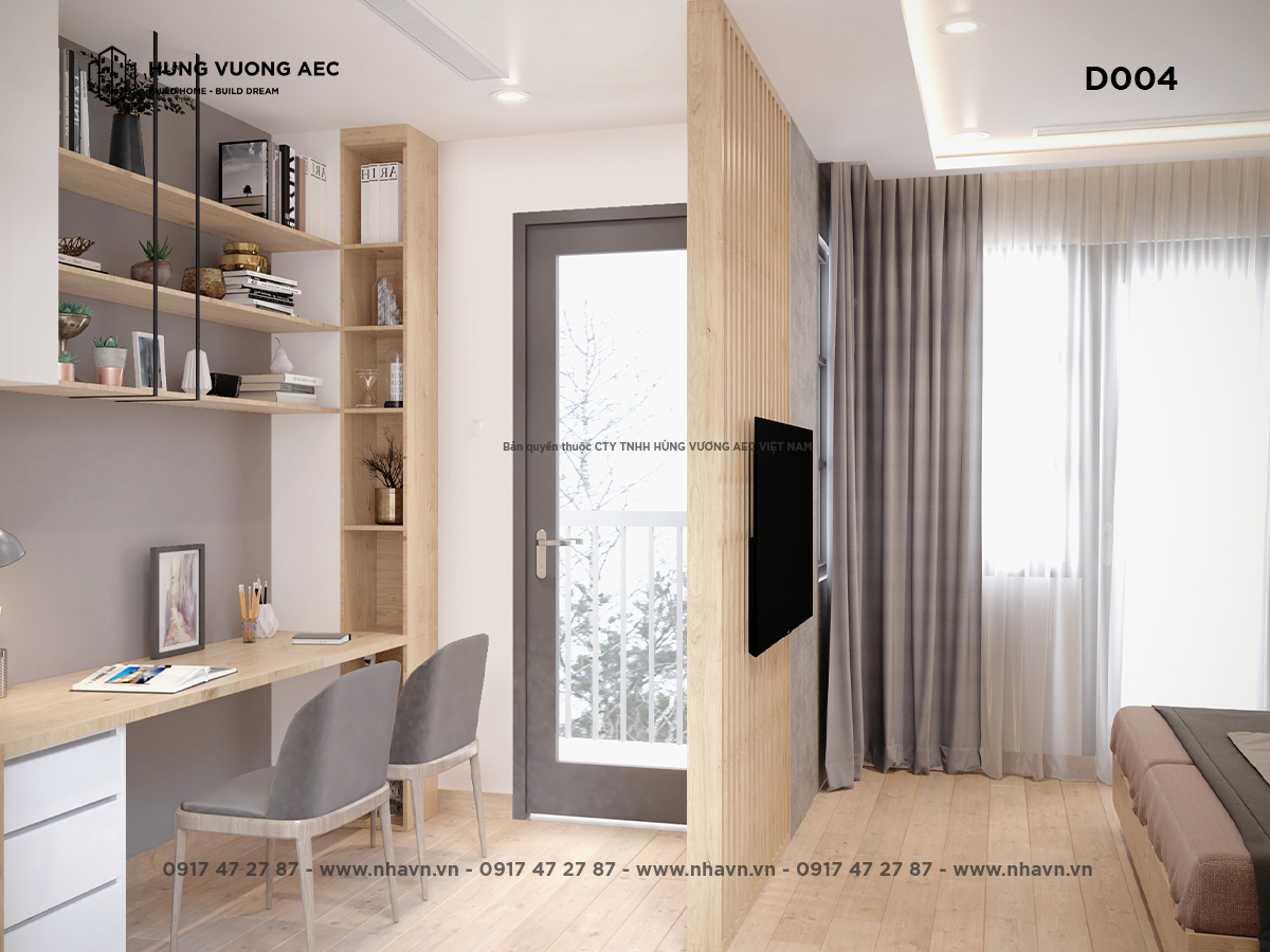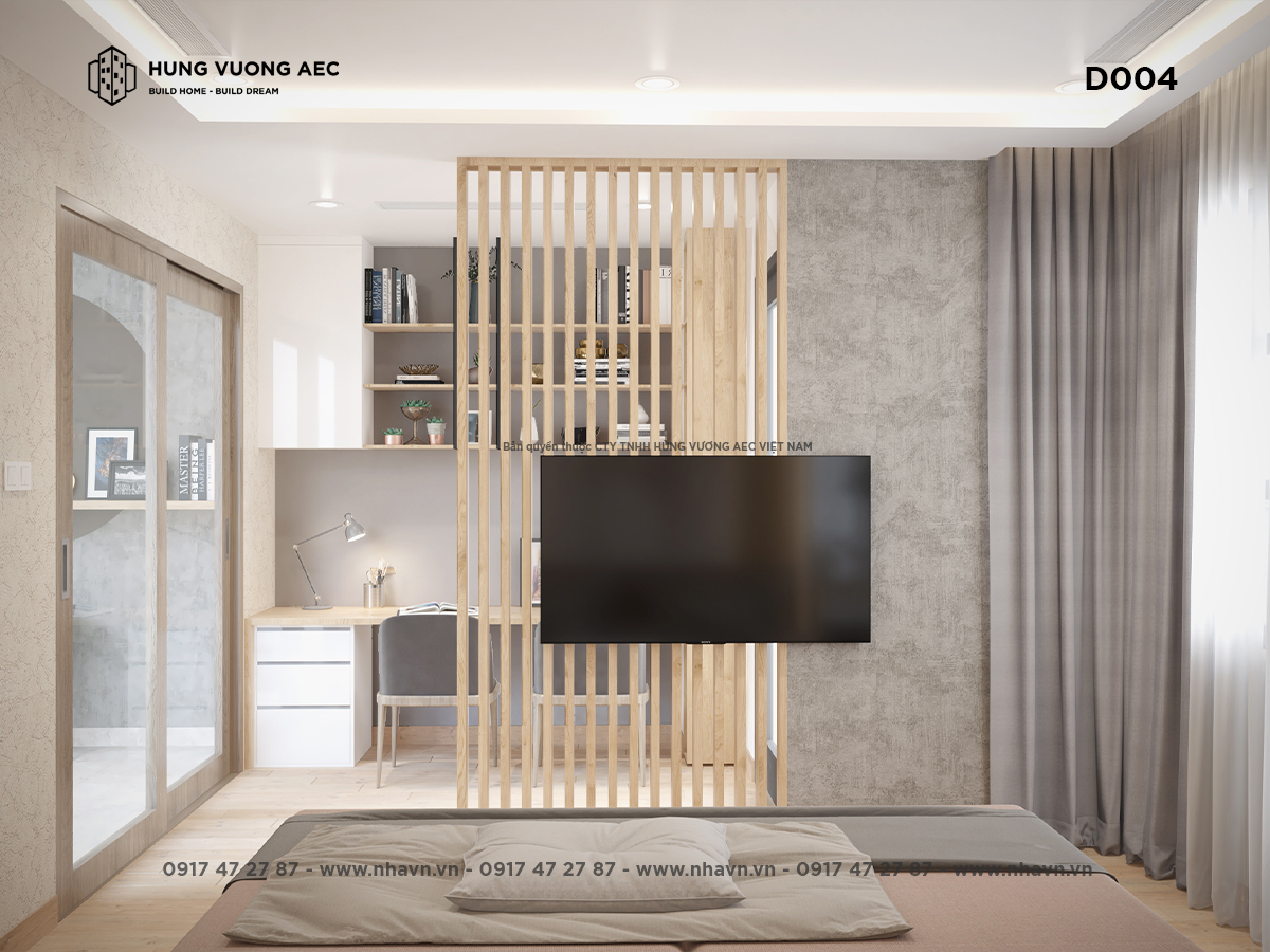 Bàn làm việc với giá đỡ làm từ gỗ được đặt đối diện giường ngủ, kết hợp với ánh sáng từ ban công, tạo cảm hứng làm việc tốt hơn cho gia chủ.