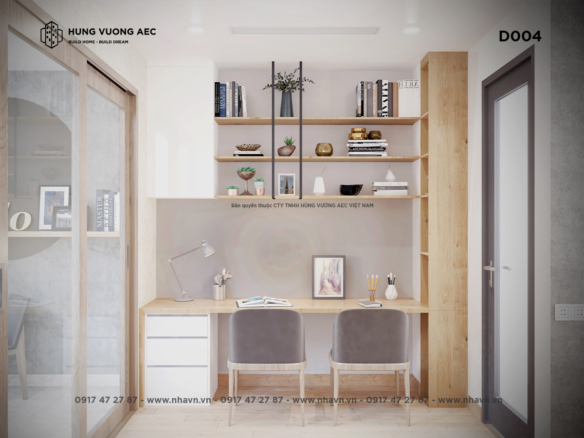 Căn phòng được bố trí với một bàn làm việc nhỏ đặt cạnh cửa sổ đón nắng, cùng với chậu cây xanh trang trí nhỏ tạo nên một căn phòng lý tưởng để gia chủ nghỉ ngơi và làm việc.