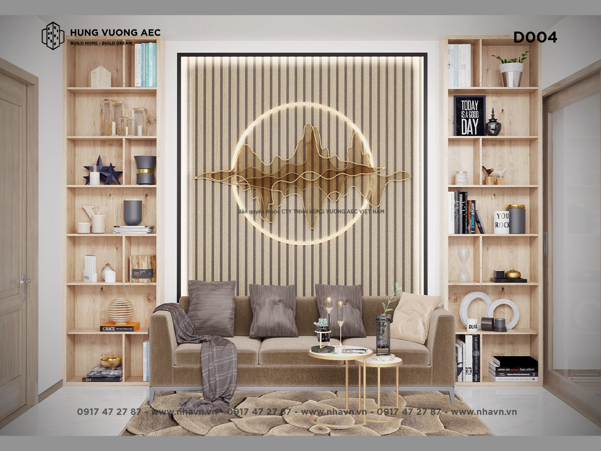 Phòng sinh hoạt chung với tranh gỗ trang trí, tạo điểm nhấn nổi bật cùng với hệ thống đèn led hiện đại.